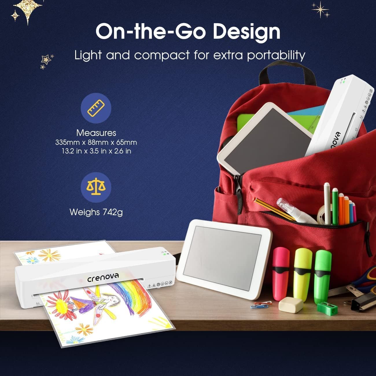 - πFast Warm-up, Vivid Color:Crenove laminating machine only takes 1-2 minutes to preheat. It compatible with 10pcs 2 x 80-125mic A6 laminating pouches. Crenova preserves your precious photos' colors, keeping memories alive.