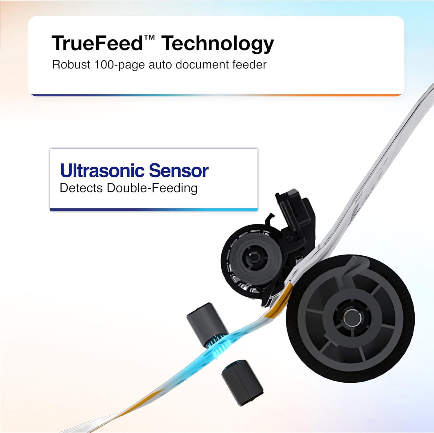 - TrueFeed Technology β Robust 100-page document feeder with paper skew and staple protection easily feeds stacks of various sized documents