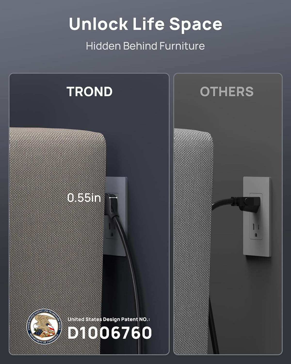 - 10ft extension cord flat plug - Made of 14awg pure copper, the 10-foot long power cord is heavy-duty and has better current carrying capacity (15a). The low-profile space-saving 45Β° angled flat plug doesnβt block the bottom receptacle