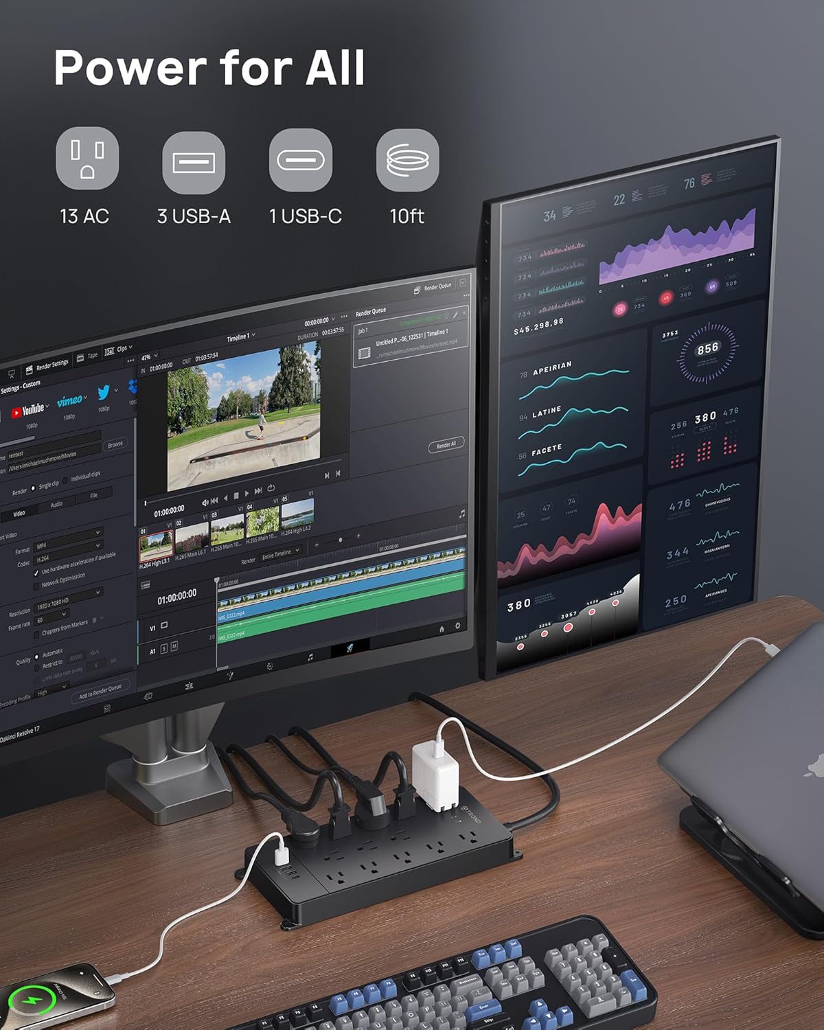 TROND Power Strip Surge Protector 10 ft Cord, 4000 Joules, ETL Listed, 13 Widely-Spaced Outlets Expansion with USB C Ports, Low-Profile Flat Plug, Wall Mount, Extension Cord, 14AWG Heavy Duty, Black