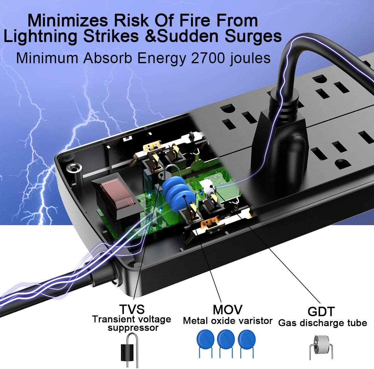 - 【12 AC Surge Protector Outlets】- The 3 level complementary Surge Protector Circuit which composed of TVS (transient voltage suppressor), MOV (metal oxide varistor), GDT (gas discharge tube), with minimum 2700 Joules energy absorbing capacity, could protect your devices much more quickly and reliably than other brand’s 1 level MOV Surge Protection Circuits.