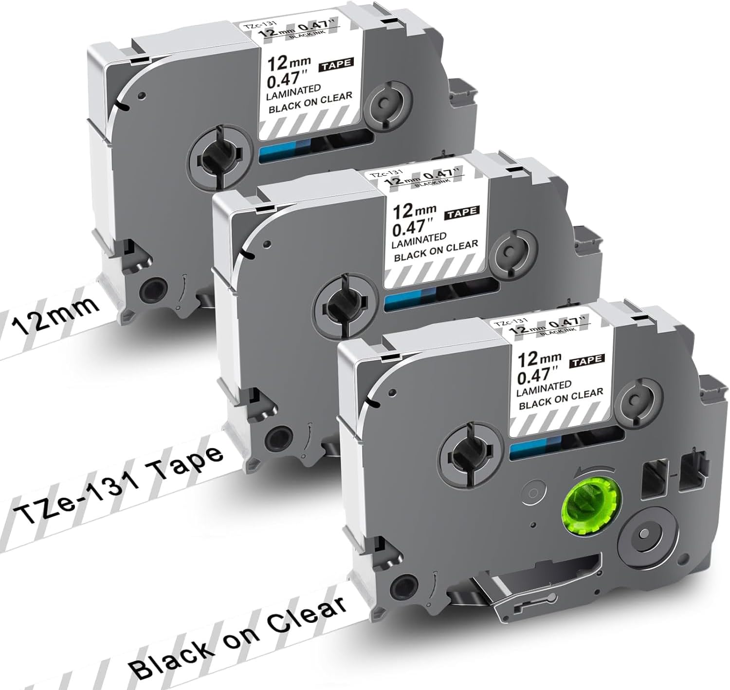 - Package Contain: 3 pack compatible for brother ptouch label tape clear TZe131(TZ-131 TZe 131 TZc-131). Size: 1/2 Inch x 26.2 feet (12 mm x 8 m). Color: black ink on clear. Type: Laminated ptouch label tape clear