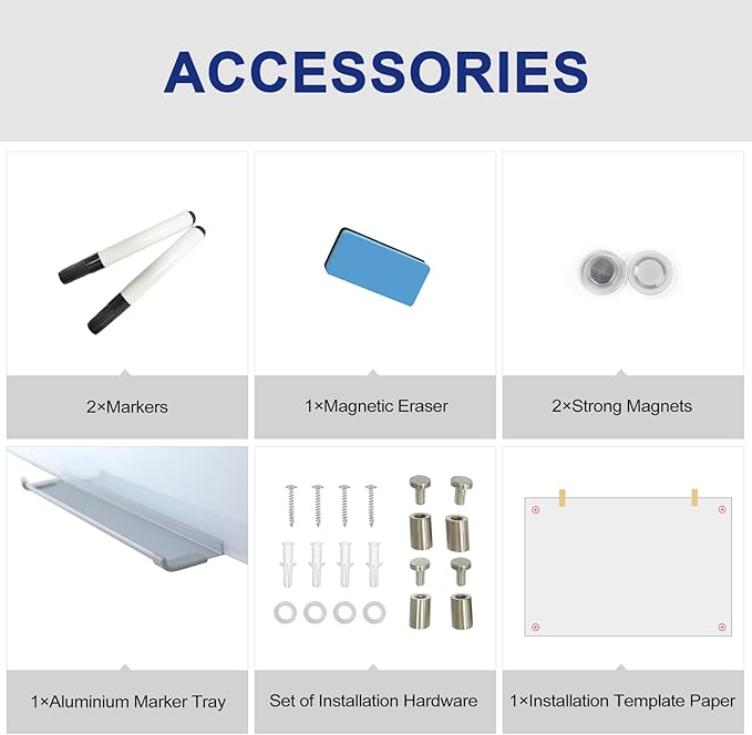- REMINDER: Our glass boards are optimized for neodymium magnets, delivering good performance. As we are in the process of upgrading product accessories (marker tray, eraser, magnets etc.), please be aware that you may receive either the old or new version. Rest assured, both versions are of high quality and can be used with confidence.