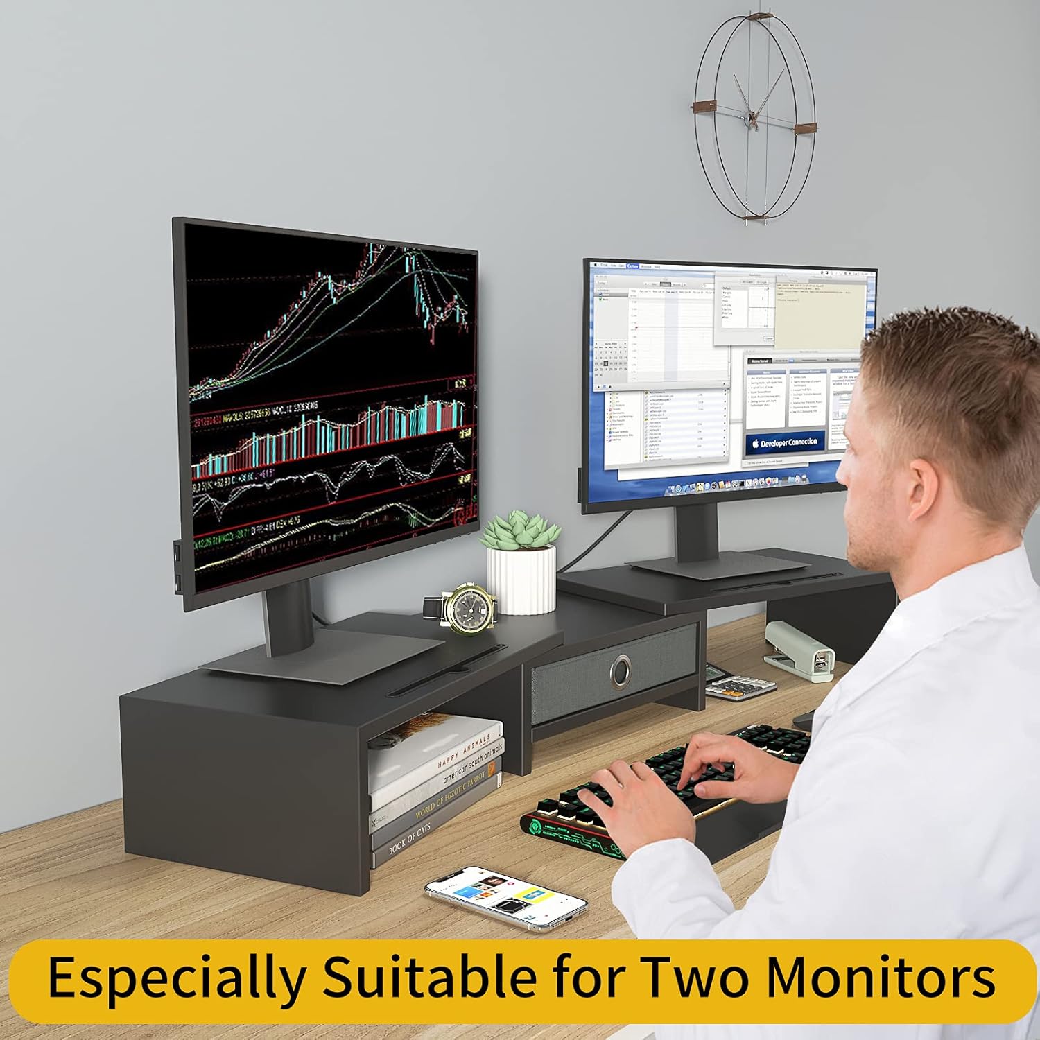 WESTREE Dual Monitor Stand Riser with Drawer, Adjustable Length and Angle Monitor 2 Solts for Phone & Tablet, Desktop Organizer Stand for Computer/Laptop/PC/Printer