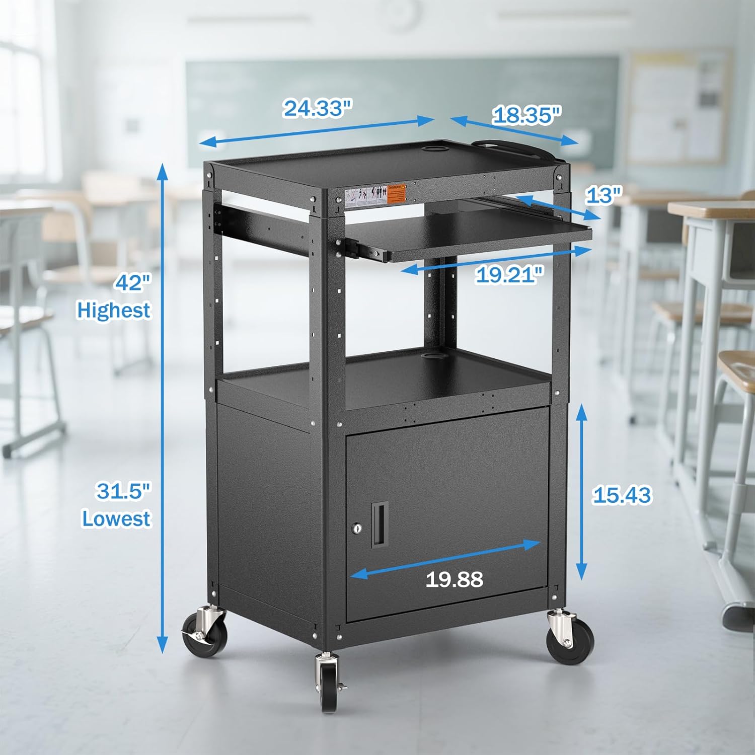 Steel Large AV Cart with Locking Cabinet - Adjustable Height Media Carts with Wheels, Pullout Tray, Power Strip for Mobile Work Station - Rolling Computer Cart for Office Classroom Presentation
