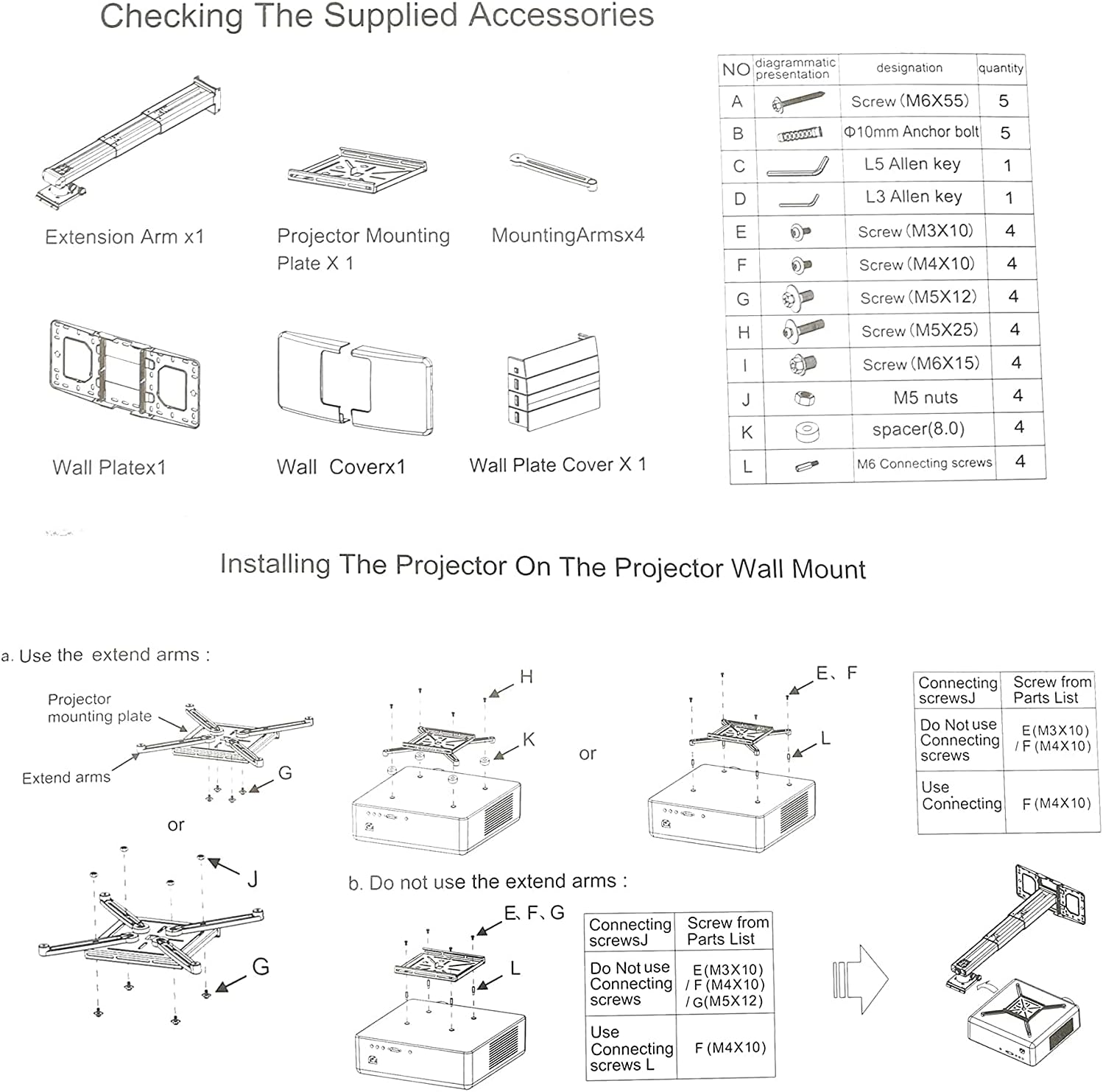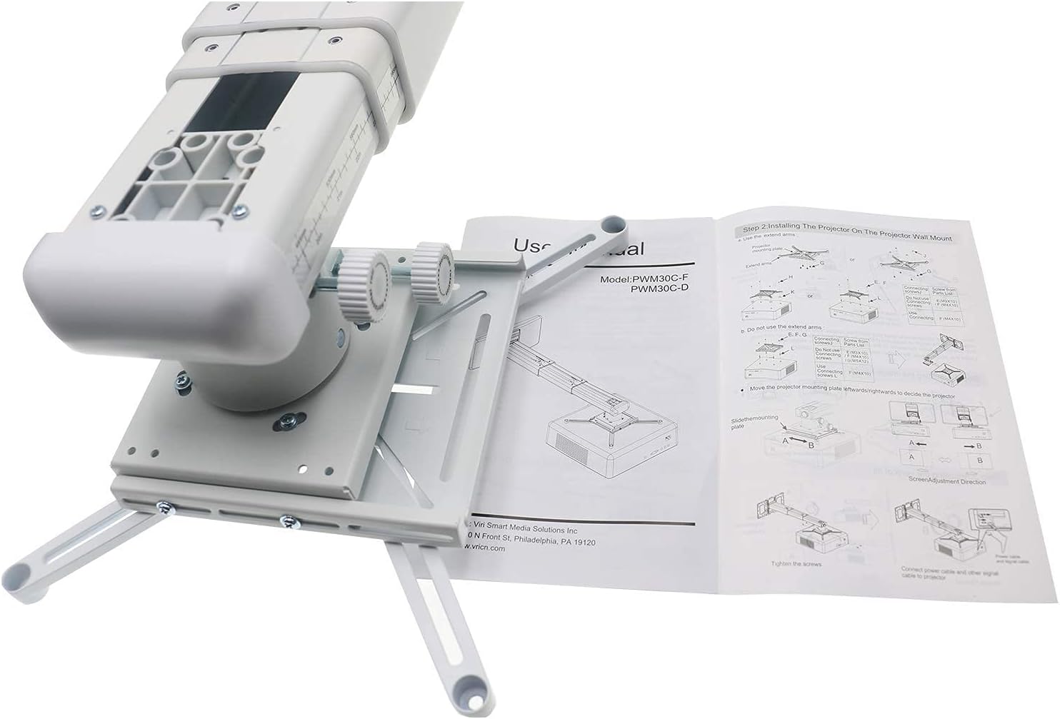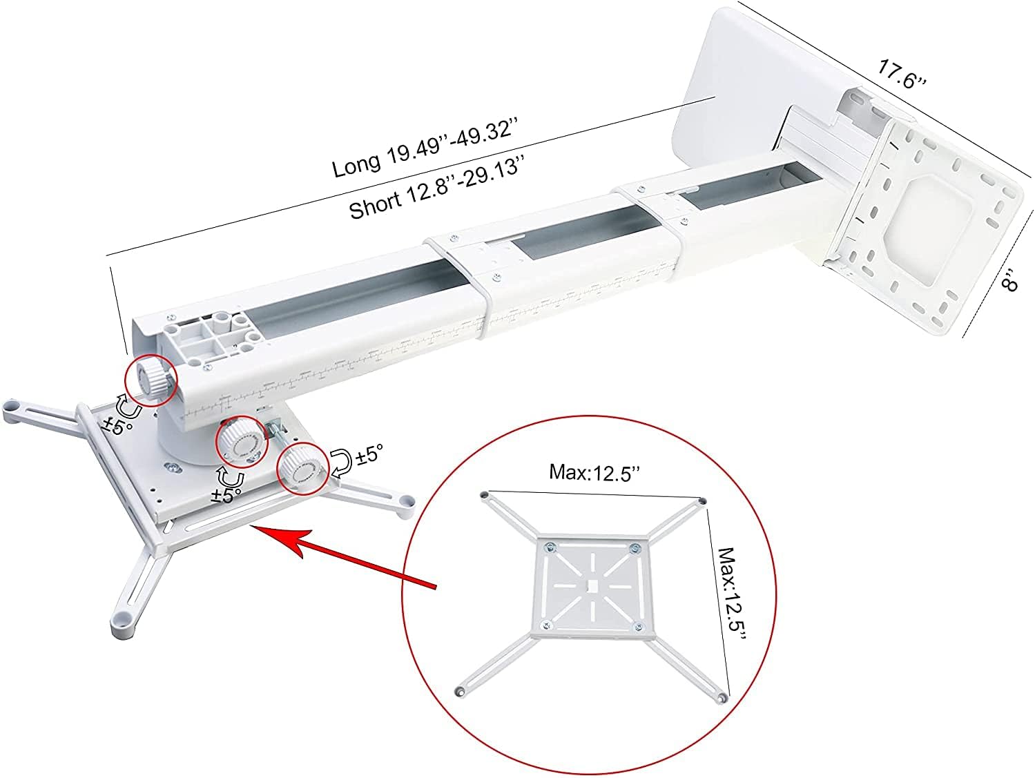 - The mounting plate of the projector bracket has four adjustable and freely retractable horizontal axis mounting arms, which is a universal mounting bracket for ultra short distance projectors. The maximum distance between mounting holes on the back of the projector must be less than 12.5 inches