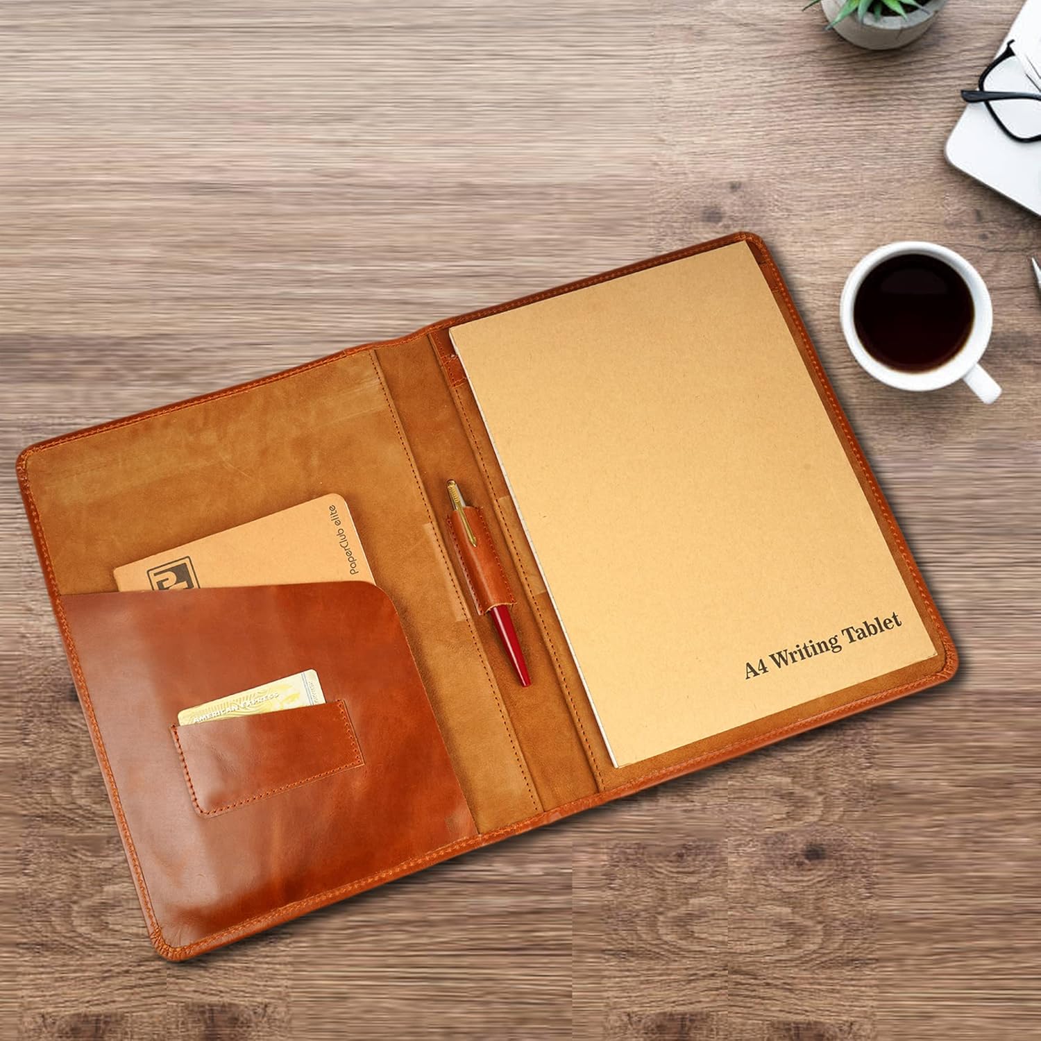 - PERFECT STORAGE - Leather folder with the size of 13β x 10β, give you a plenty of storage. A sleeve holder perfect for the legal pad writing pads and A4 notepads & paper sheet, 1 pen slot, 1 wave-shaped business card holder and 1 side pockets for documents. This wonderful leather notepad construct without annoying zipper will organize your paper stuff very well. And what is more, it will add your confidence and great first impression definitely.