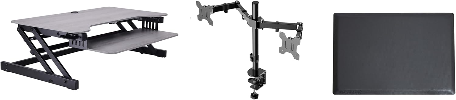 - Standing Desk Converter Bundle includes 37.5" Desk Riser (R DADRG), a Dual Monitor Arm (R DM2) to free up desk space and mount 13"-27" flat panel monitors, and an anti-fatigue floor mat (R MAFM) in order to provide long standing comfort.