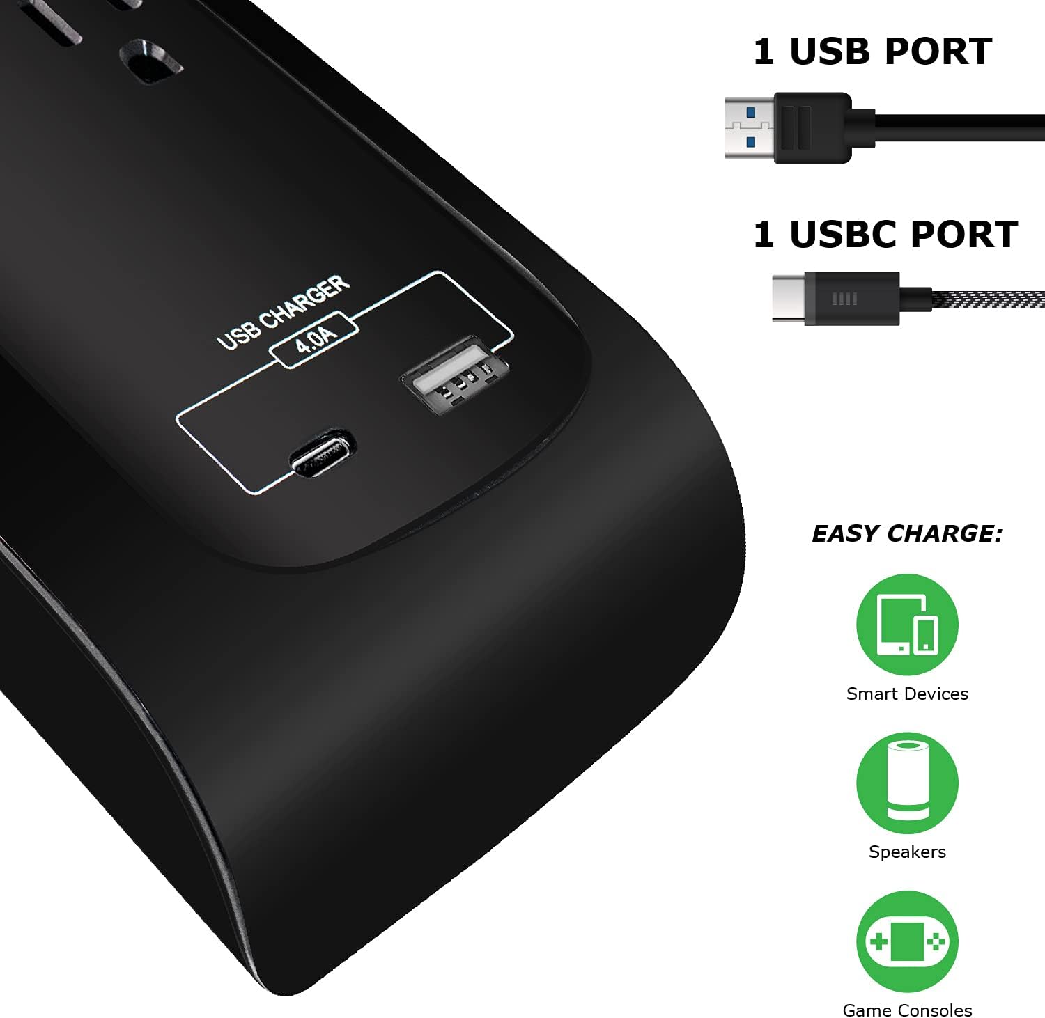 - Featuring a USB-C port (1A+3A) for charging compatible devices directly. Most modern phones and tablets use UCB type C charging cables. On/Off switch to conserve power. Circuit Breaker Prevents Overloads. Meets Safety Standards: ETL Listed, Conforms to UL Standard No. 1363 and ANSI / UL Standard 1449.