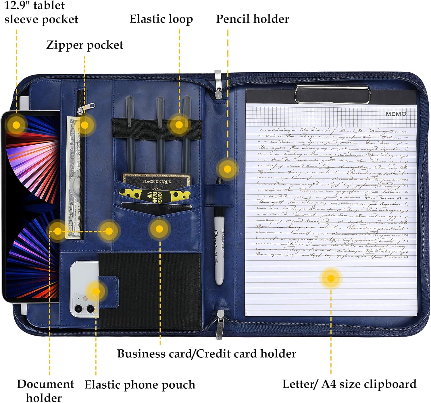 - Multiple Compartments: [left side] business card holders, pencil holders, a pocket, a 12.9" tablet sleeve, elastic phone pouch, file folder and zipper pocket; [middle] a pencil holder; [right side] a clipboard and 20 pages notepad; [outside] Extra pocket