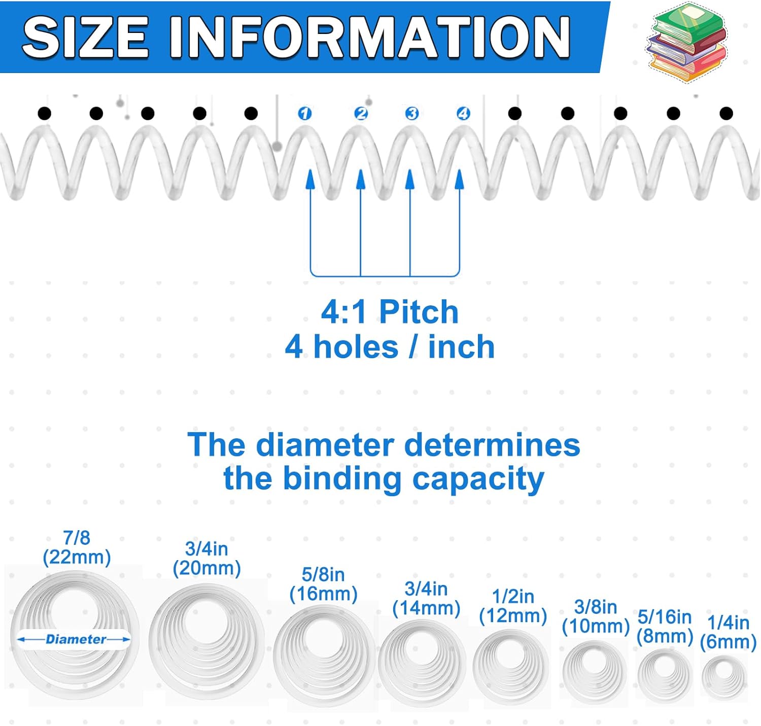 - 【4:1 Pitch & 48 Loops】Spiral Binding Coils (48 loops) are designed with a 4:1 pitch, fit any 4-holes-per-inch coil-binding machine, and letter paper is 8.5 x 11.0 inches. It helps to combine the report pages, calendars, documents, and more, providing much convenience to daily work or study. Their 4:1 pitch matches the 4-holes-per-inch punching pattern on the side of your book.