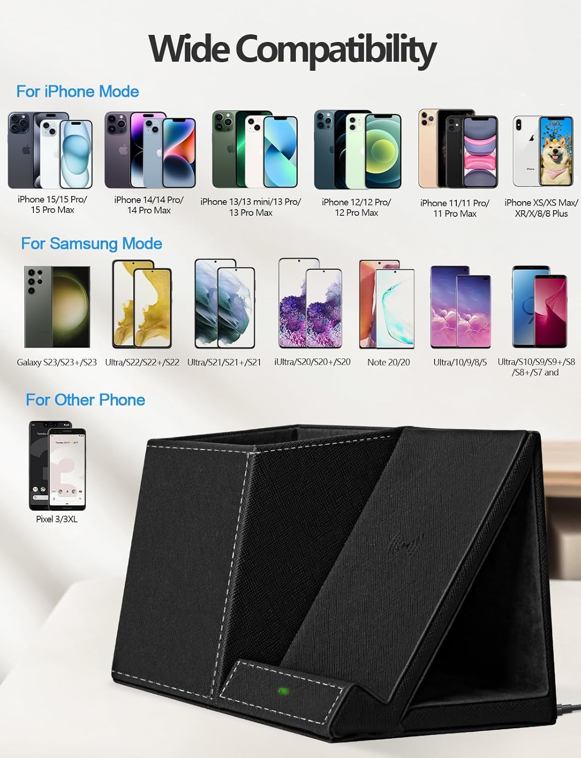 - βββ Universal Compatibility of Wireless Charger: 7.5W fast charging for iPhone 17/16/15/14/14 Plus/14 Pro/14 Pro Max/13/13 Pro/13 Mini/13 Pro Max/12/SE 2020/11/XS/XR/X/8; 10W fast charging compatible for Samsung galaxy S24/S23 Ultra /S23/ S23+/S22 Ultra / S22 / S22+ / S21 Ultra /S21+ / S21/ S20 Ultra / S20/Note 10/S10/S10E and So on; (Note: Adapter is NOT Included)
