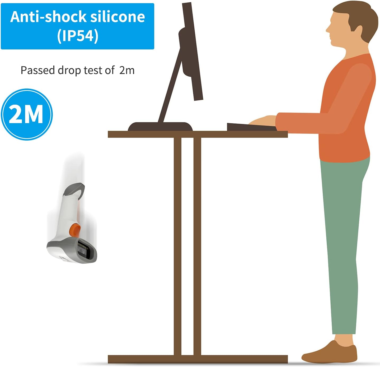 - ➤Professional Anti-Shock Design - Made of great ABS+PC materials,high shock-resistant, and the silicone protective cover can avoid the scratches and friction while falling from the height of 6.57 feet; the technical of IP54 sturdy which protect the wireless barcode scanner from dust and moisture.