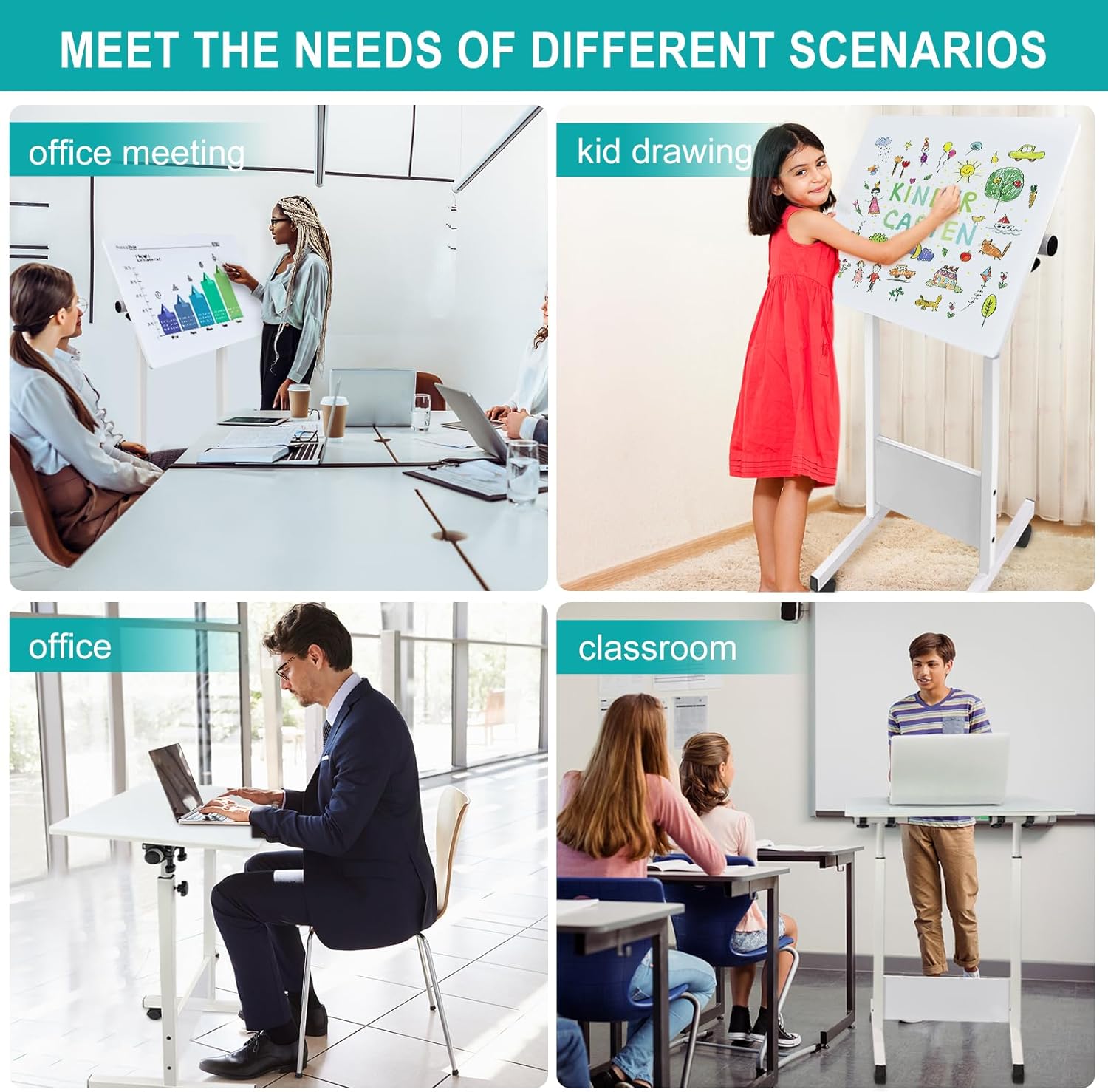 KOUPA Adjustable Height Standing Desk, Writable Tempered Glass Desktop with Eraser, 360° Flip, Wheels – Ideal for Small Spaces and Home Offices, 24 in, White(Adjustable Height: 32-47 in)