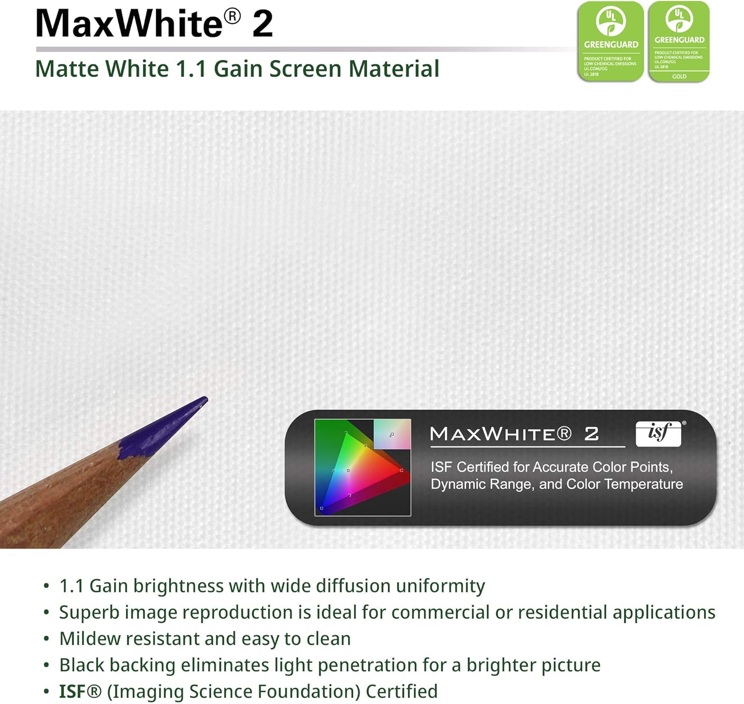 - Screen Material: MaxWhite 2 (matte white), 1.1 Gain. Multi-layer weave 4K Ultra HD and Active 3D Ready FRONT Projection Screen with Black Backing. Features a 180° viewing angle is, easy to Clean and is GREEN GUARD and GREENGUARD GOLD certified for Safe/Clean Indoor Use. Compatible with Standard UHD/HD projectors. ***NOT compatible with Short Throw and Ultra-Short Throw Projectors.