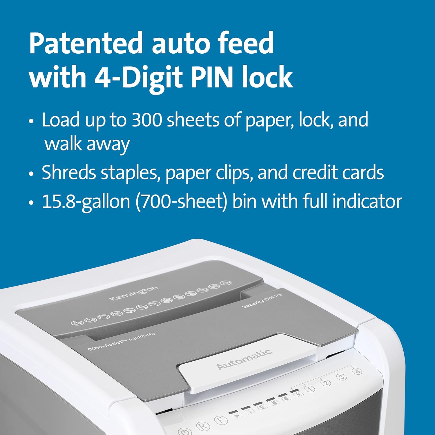 - Patented auto feed with 4-digit PIN lock lets you load up to 300 sheets of paper, lock it until shredding is complete, and walk away. Shreds staples, paper clips, and credit cards