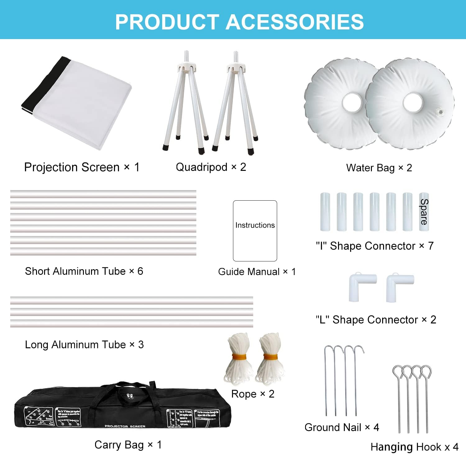 - What You Get- 100 inch Projection cloth ×1, Short Aluminum Tube ×6, Long Aluminum Tube ×3, “I”Shape Connector ×7, “L”Shape Connector ×2, Rope ×2, Carry Bag ×1, Quadripod ×2, Water Bag ×2, Ground Nail ×4, Hanging Hook ×4, Guide Manual ×1. Please be careful to use the projection screen in strong wind, heavy rain, heavy snow