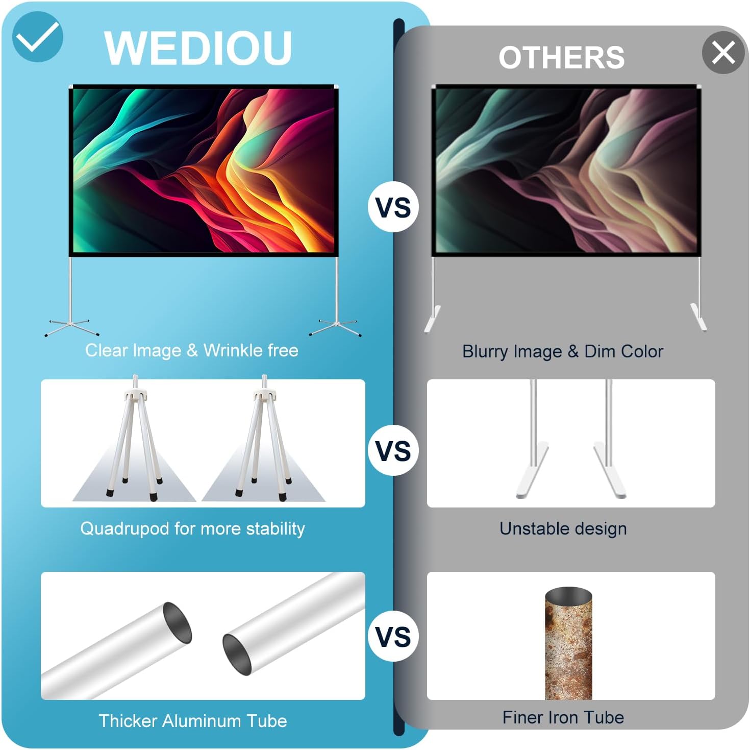 - Portable & Easy To Set Up - The camping projector screen comes with a foldable stand that can be easily assembled and benefit for fast installation. The innovative cross base strengthens the overall stability of the screen, maintains the balance of the entire screen