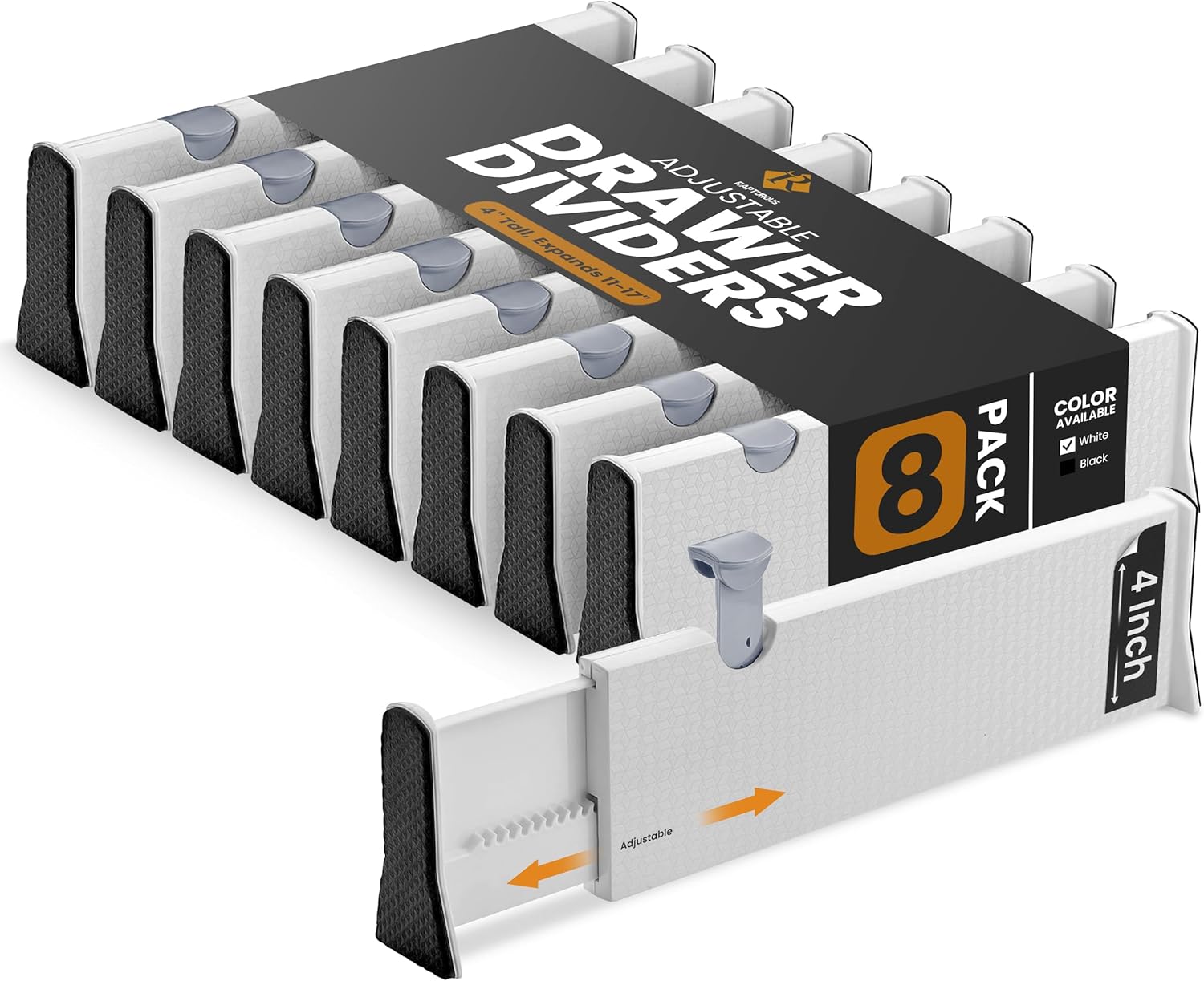 RAPTUROUS 4" Tall Drawer Dividers, 8-Pack, 11-17" Long, Expandable & Adjustable, Strong & Sturdy Non-Slip Dividers for Dresser, Closet, Kitchen, Nursery, and Office (White)