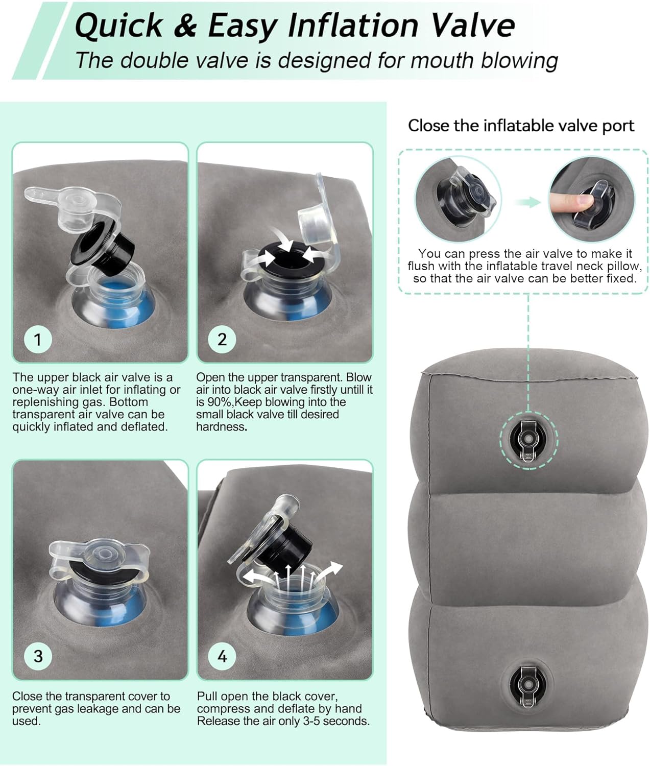 - ✈️UNIQUE HUMANIZED DESIGN: This inflatable leg rest has two separate air chambers. The lower chamber for 1-level height, and the upper chamber for 2-level height. With 2-in-1 double valve, the upper black air valve is a one-way air inlet for inflating or replenishing gas. Bottom transparent air valve can be quickly inflated and deflated. What's more, the double valve is designed for mouth blowing, It only takes about one or half minutes with a few breathes. Release the air only 3-5 seconds.
