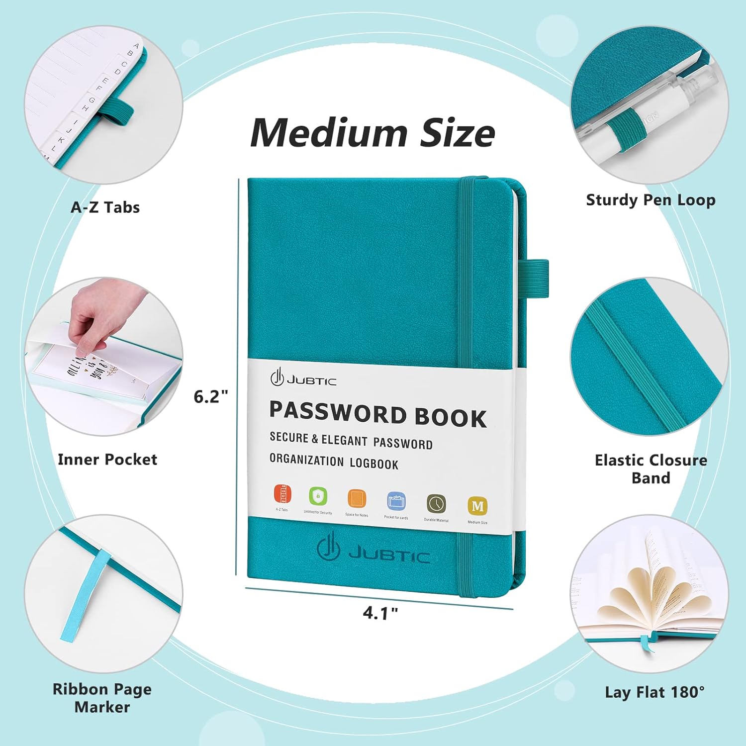 JUBTIC Password Book with Alphabetical Tabs. Medium Size Password Keeper Logbook for Internet Log in, Website Address. Hardcover Password Journal Notebook & Organizer for Home Office, Turquoise