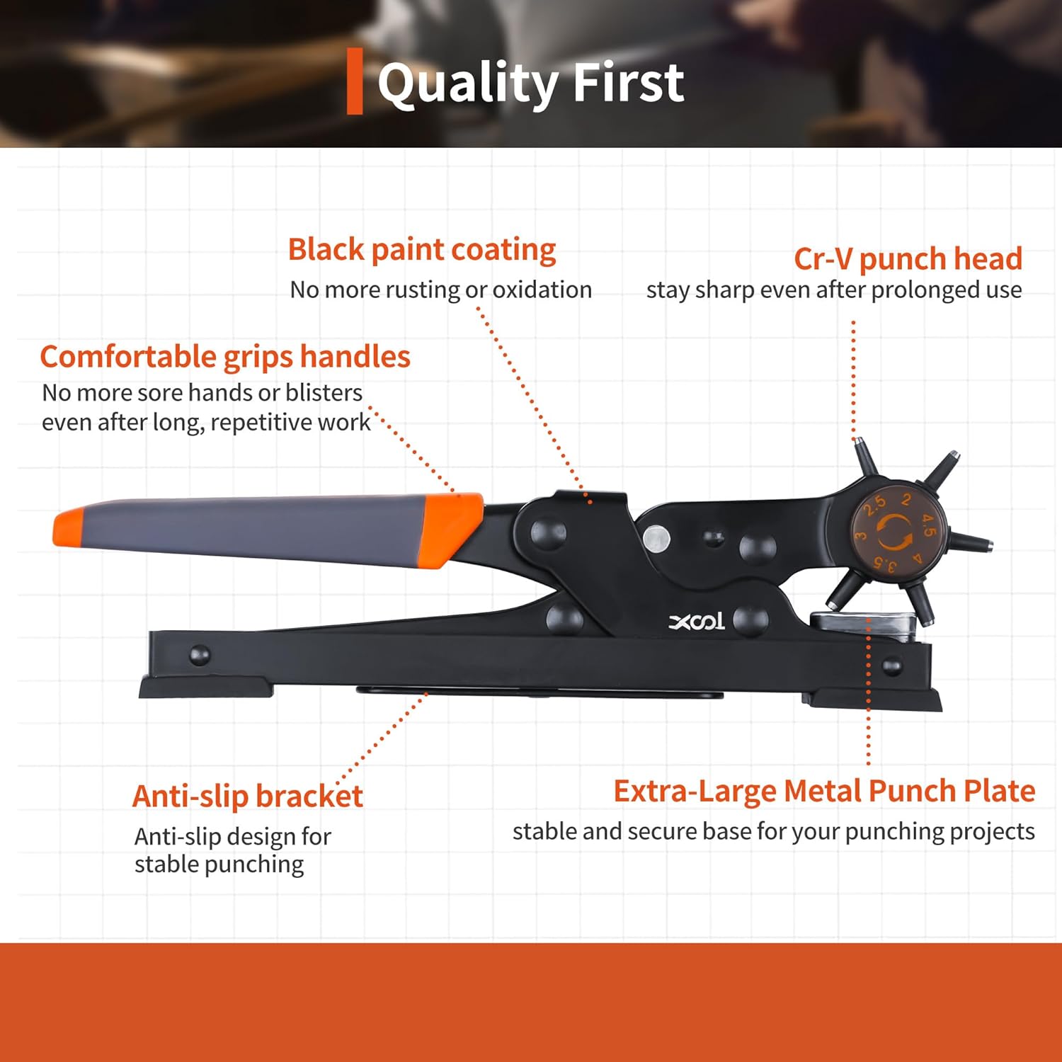 - 【High Quality and Safety】 The durable punch plier is made of plated steel that is high hardness, good toughness and durable. The surface of metal deal with spray lacquer process to avoid oxidation. The thickness of the punching plate is designed to ensure safety and make auxiliary punching easier.