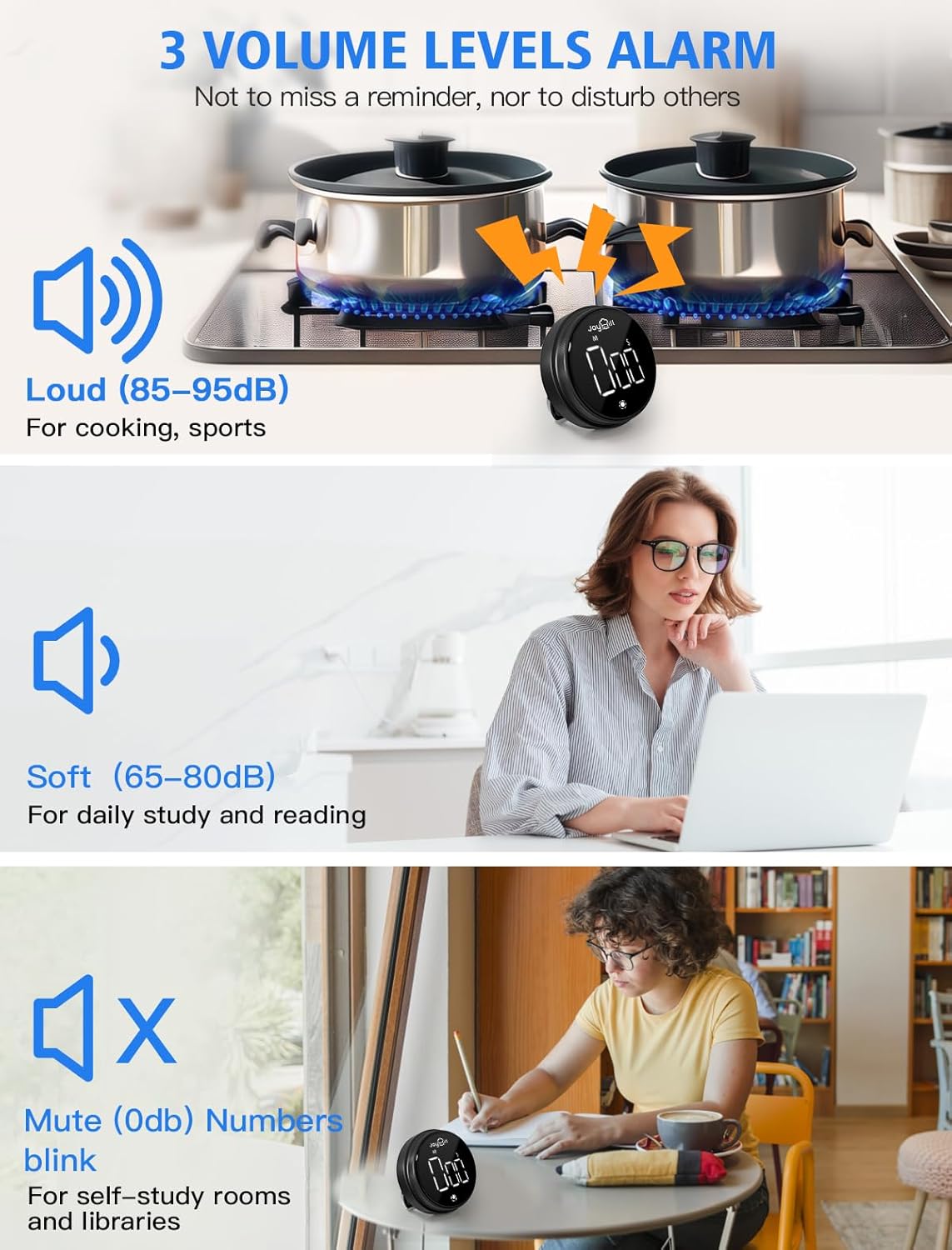 - 3 Volume Levels Alarm: Loud (85-100 dB) volume is proper for important remind. Medium volume(65-80 dB) can be set during reading with no disturbing on your mind; Mute (0 db) for study room or library,it will blink to remind you when time arrival