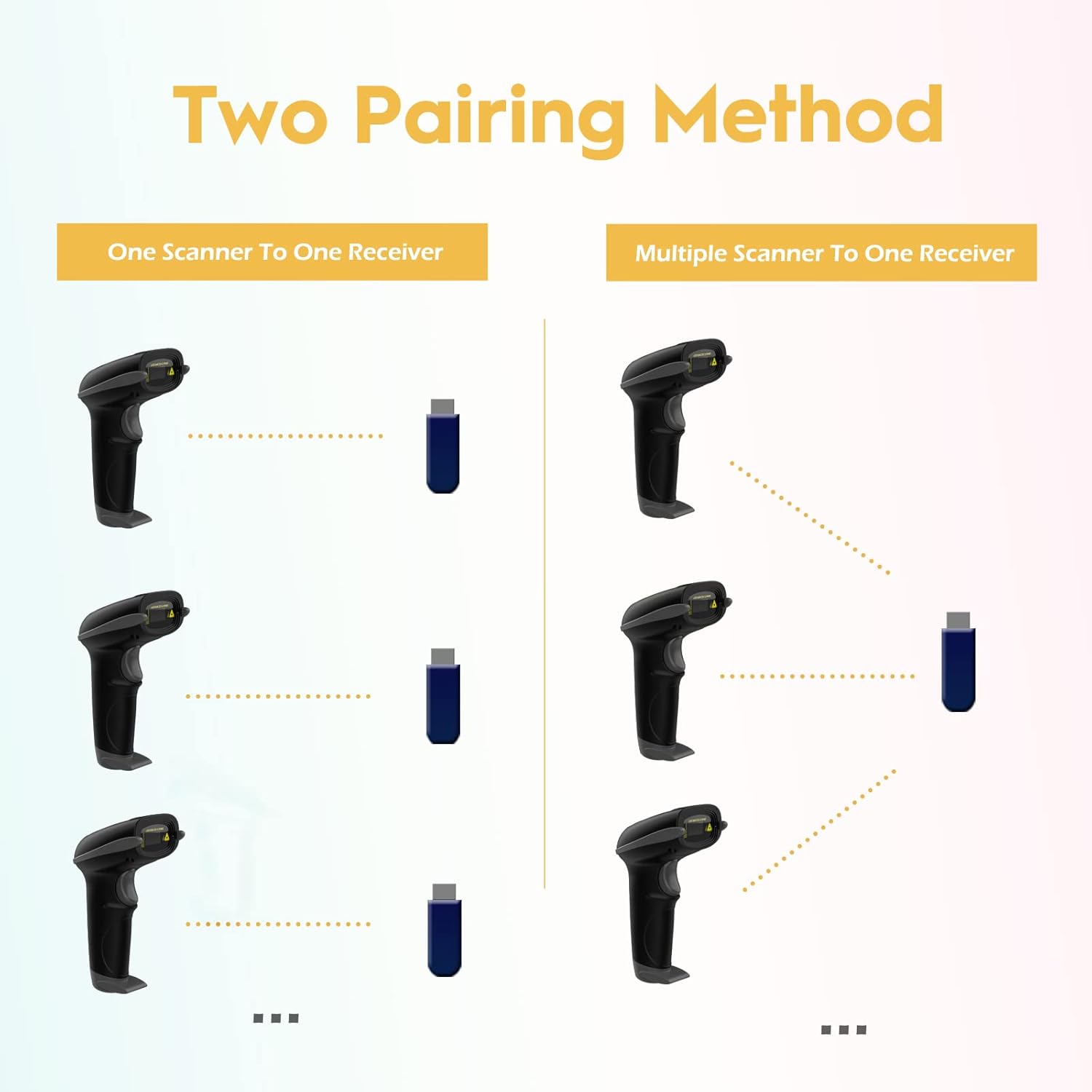 - Two paring mode: One-to-one mode,Multiple-to-one mode. At one-to-one mode,one scanner only transmit barcode to the one usb receiver. AT Multiple-to-one mode,Multiple scanners can transmit barcode to the one usb receiver - ideal in a warehouse where several people are scanning at once.