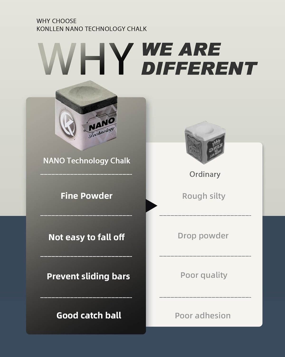 - Nano Technology: KONLLEN pool hand chalk utilizes revolutionary nano-materials, ensuring an ultra-fine texture with superior adhesion. It resists flaking and spreading, making it more environmentally friendly and healthier. With KONLLEN, you can achieve the best feel and performance in any condition.