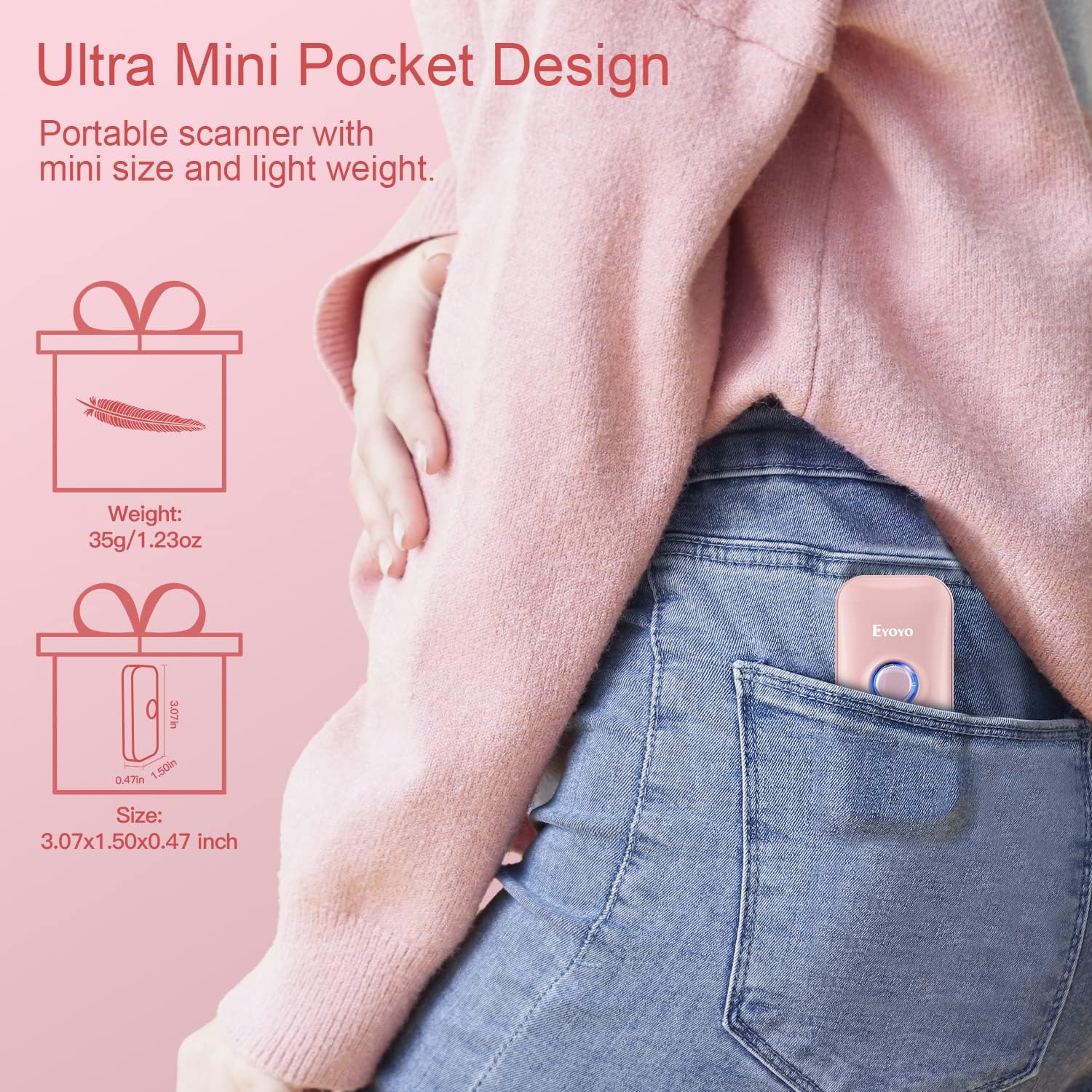 - Specially Design for Women: It's the best gift for your wife or girlfriends. No woman can resist this pink, mini pocket 1D barcode scanner. Bring more color and pleasure to your boring scanning life. Eyoyo portable scanner especially for bookstores, online stores, sales shops, warehouses, etc place. It's a wonderful Valentine's Day present to your girlfriend or wife