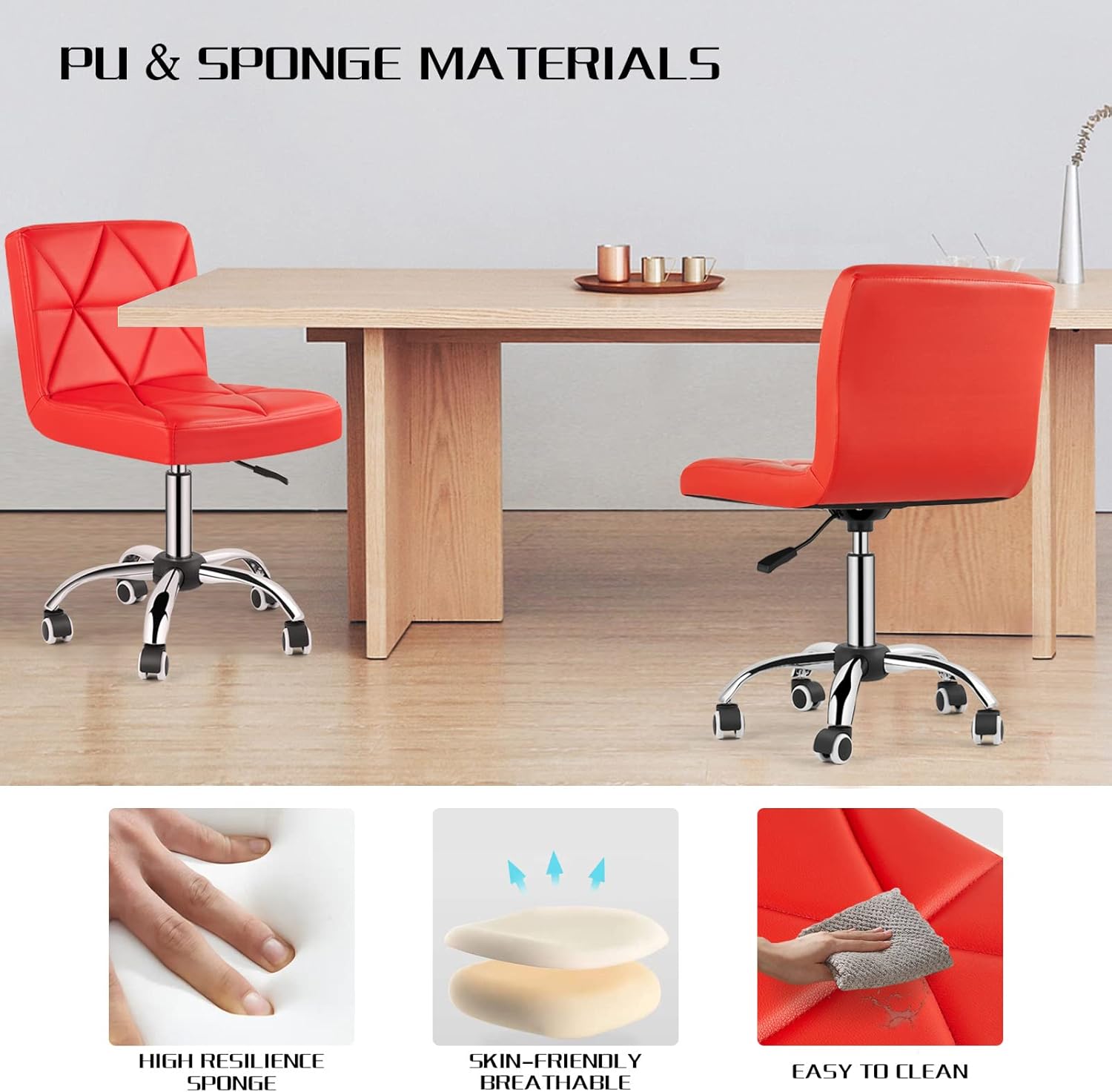 - PU & HIGH ELASTIC FOAM - Made of skin-friendly and breathable material, the mid back task and desk chair is specially designed for your all-day comfort and support. Besides, the waterproof and wear-resistant surface adopts diamond-shaped patterns, which is beautiful and elegant.