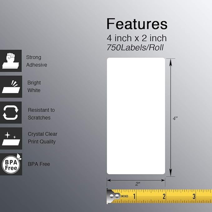 - [ Specifications ]: 4 in x 2 in (102 mm x 51 mm) (750 Labels/Roll, 16 Rolls),Paper tube diameter:1"(25.4mm). No Ink Toner or Ribbons Needed! Save your money and effort.