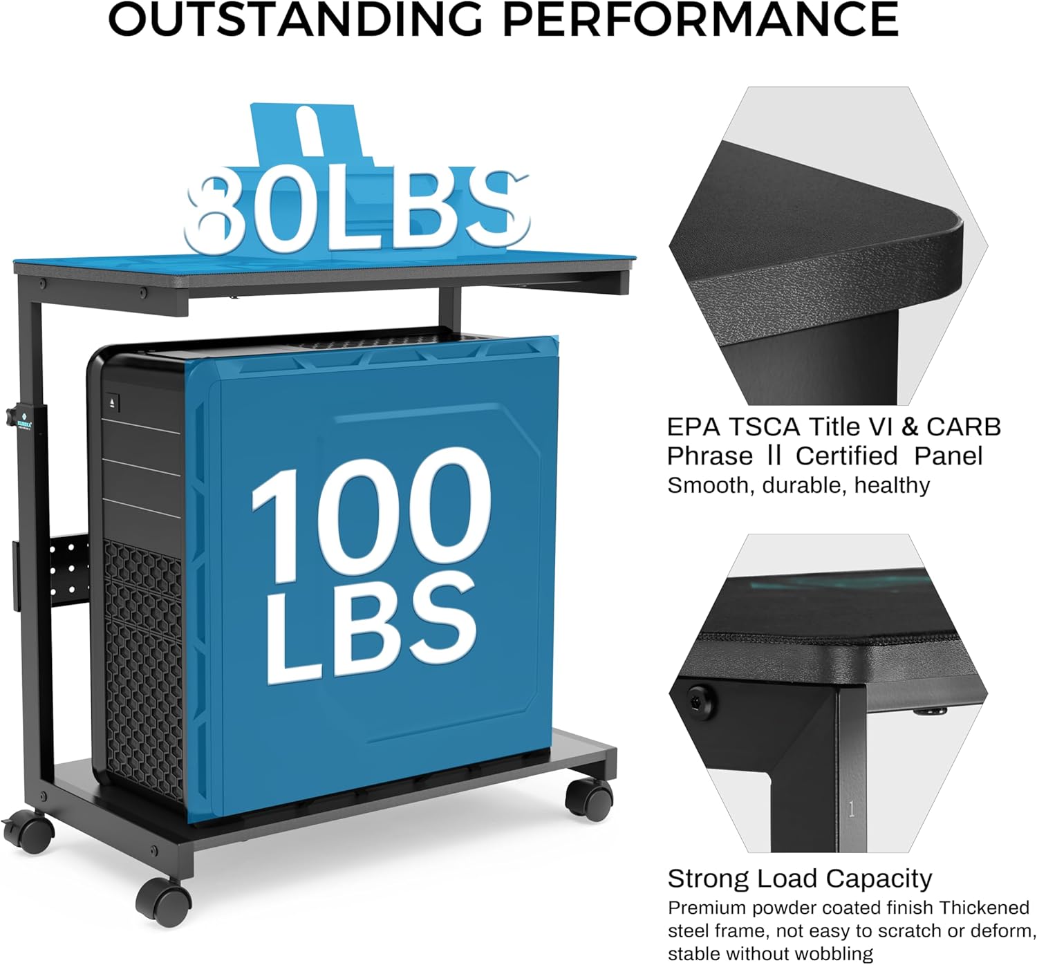 - Sturdy Structure: EPA TSCA Title VI & CARB Phase β ‘ Certified desktop panel with premium anti-scratch finish. Thickened steel frame with powder-coated finish resists corrosion to ensure stability and durability, is not easy to scratch or deform, no wobbling. The bottom shelf max weight is up to 100 LBS, the top shelf is 80 LBS. NOTE: When moving, the cpu stand can only support up to 80 LBS.