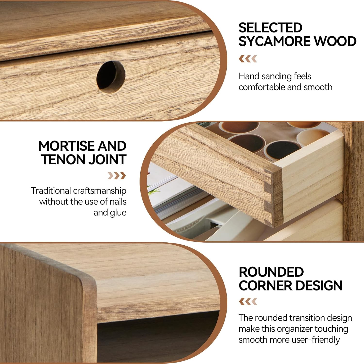 - [EXQUISITE WORKMANSHIP]: The desk organizer is made of selected real wood, the texture is clear and natural, exquisite workmanship,hand polishing.