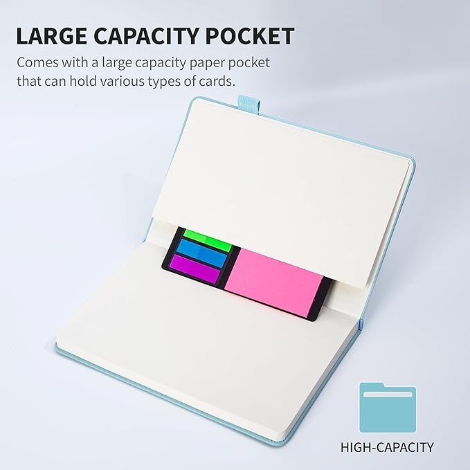 - đăMultifunctional AccessoriesăâThis classic 5.6" x 8" vegan leather journal features a durable and water-resistant cover, 160 college ruled lined pages, inner expandable pocket, pen holder, ribbon bookmark & elastic closure band