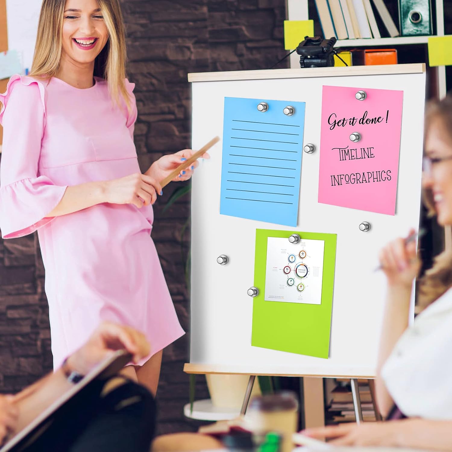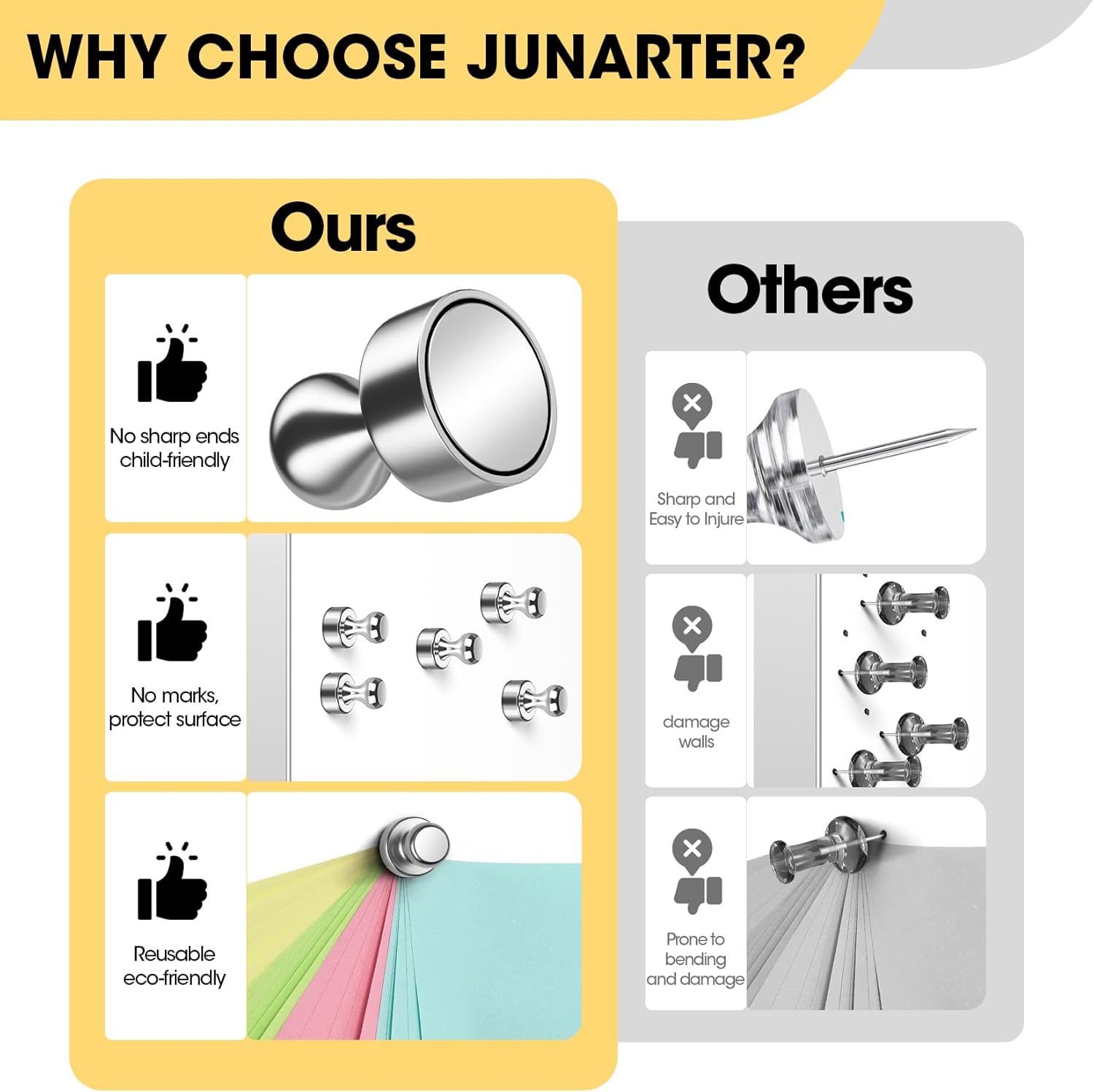 - 🛒WIDELY USED: The push pin magnets are used to hang the recipes and pictures on the refrigerator and assist your display in reporting to your leader in the office. Apart from these scenes, you can use these strong whiteboard magnets wherever you need to hang something. What it deserves to mention is that it is easy to use and leaves no scratch on the surface.