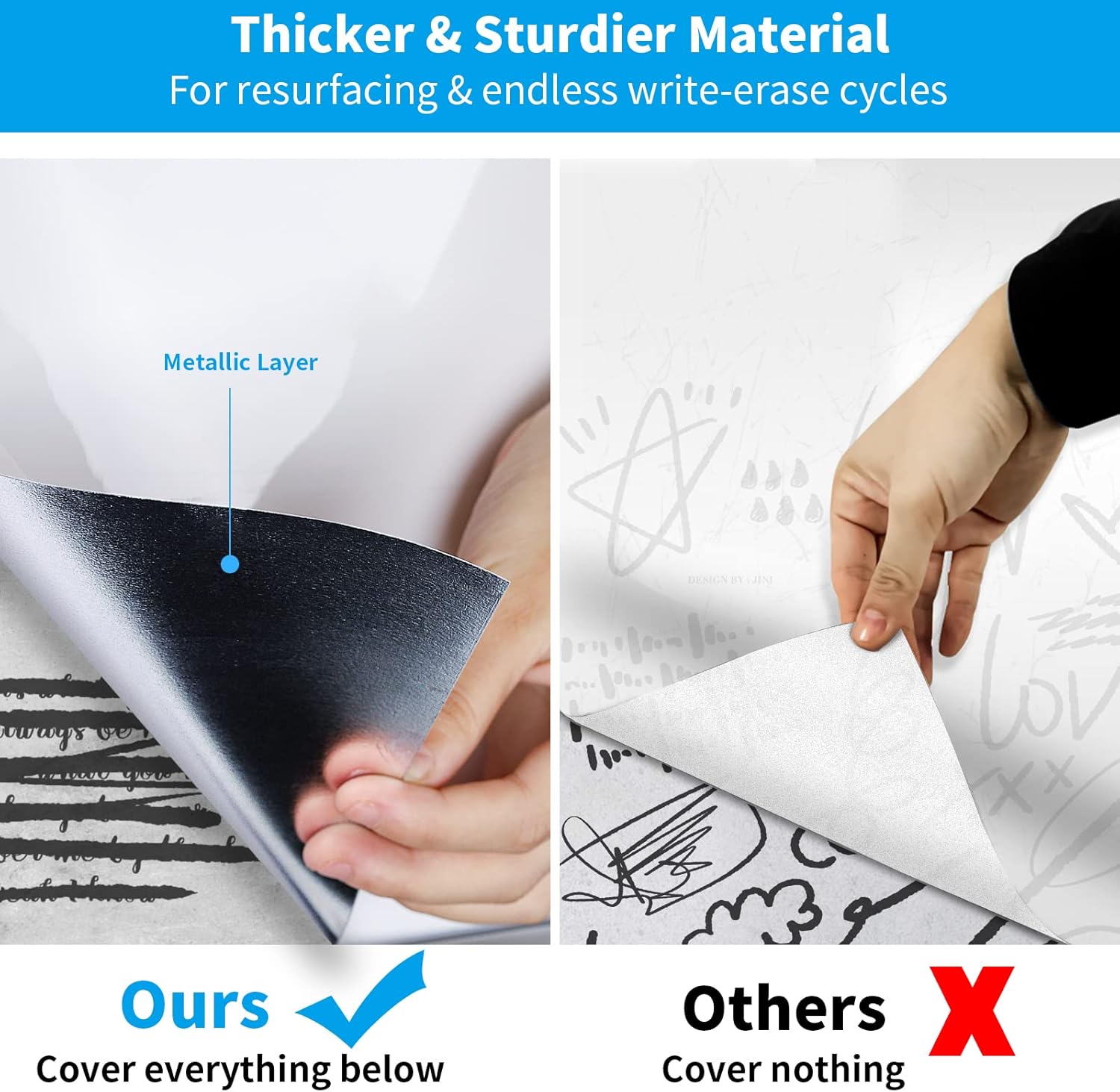 - THICK & STURDIER Dry Erase Wallpaper: This white board roll is made of premium material of high cost, itβs odor-free, non-toxic, and safe for even small hands to doodle on. Under the PET writing surface there is the metallic layer that thickens the dry erase decal with strong covering power, helps block light and completely covers the graffiti on wall, and improves writing experience by letting you feel like writing on a true dry erase board instead of on a wall.