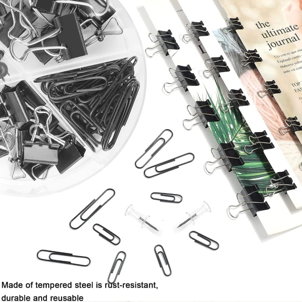 Paper Clips and Binder Clips Set, Metal Assorted Sized Binders with Push Pins, Black Office Supplies for Desk, Durable Desk Accessories