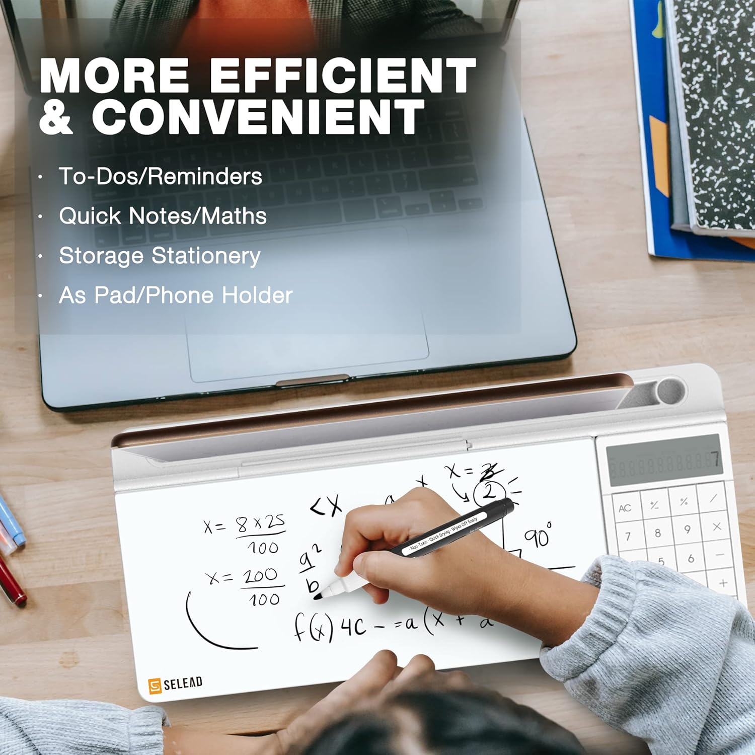 SELEAD Desktop Glass Whiteboard with Calculator, Organizer, Markers, Eraser, Holder - Small Dry Erase White Board Computer Pad Keyboard Stand Desk Drawer Accessories for Home, School, Office