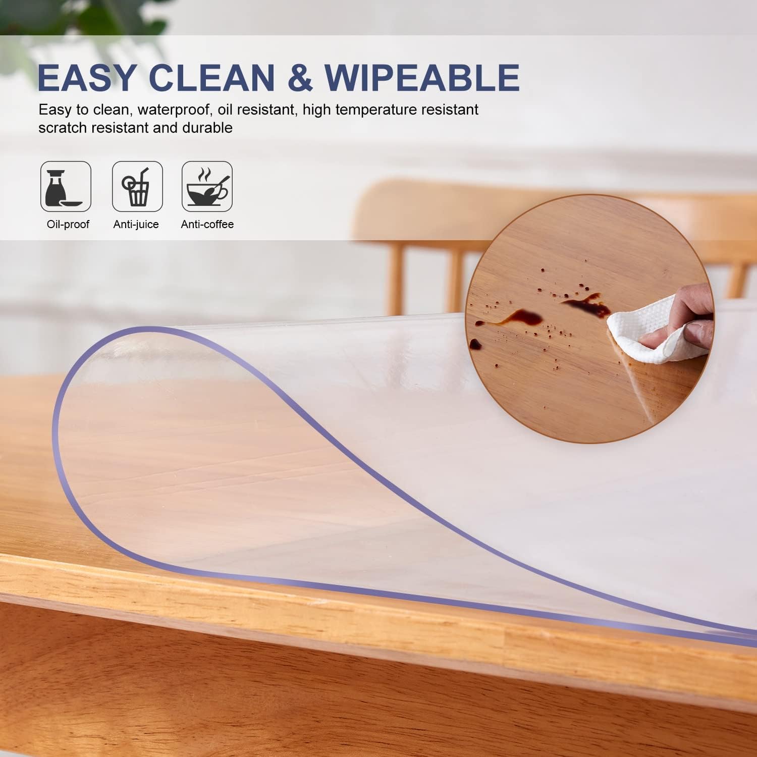- B.Durable,Wipable, Waterproof and Heat-resistant 1.5mm thickness heavy duty, heat resistance up to 176Β°F. Use as table runner or desktop mat, to better protect your expensive wooden, glass, granite, marble,or use as office computer or writing desk clear blotter pad, coffee bar or pub dining table pad, cooktop, furniture tops liner against scratches, scuffs, oil stains, coffee spillage, heating scalds; Simply wiping this pvc table cover with a damp cloth that can get all the mess off its surface!