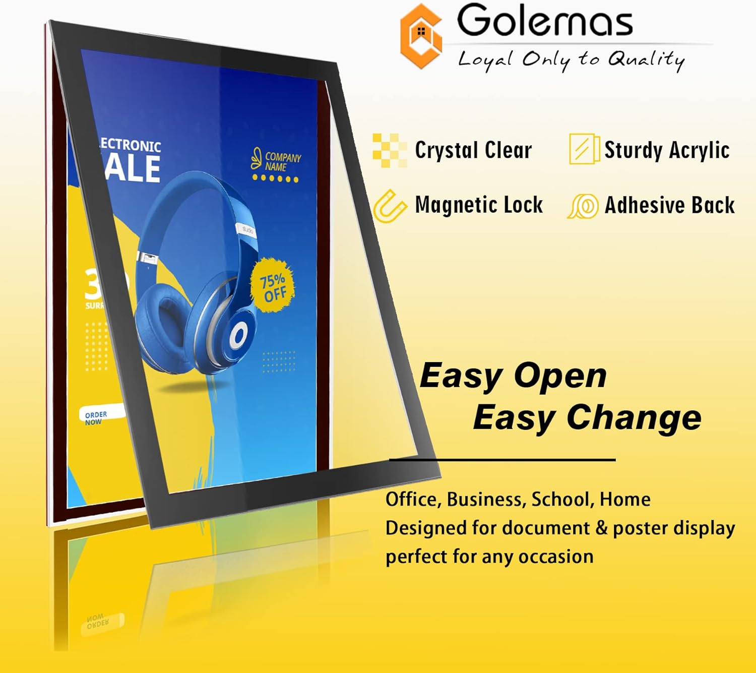 - MULTI-USE FRAME: Golemas Acrylic Magnetic Display Frame is a great tool to display signs in store, restaurant, school, office, factory, bank, hotel and so on. Meanwhile it's a great choice to use it at home to present photographs and artworks on a refrigerator or cabinet.