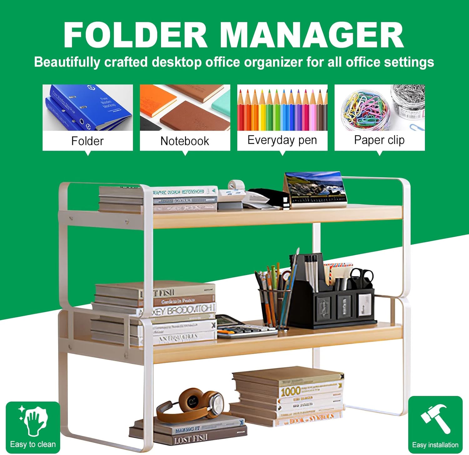 YGYQZ Wood Office Desk Shelf Organizer - Desktop Supplies Cute Dresser Top Organization Storage Rack and Cubicle Decor Aesthetic Bookshelf for Women Man and Kids (White-Two Tier)