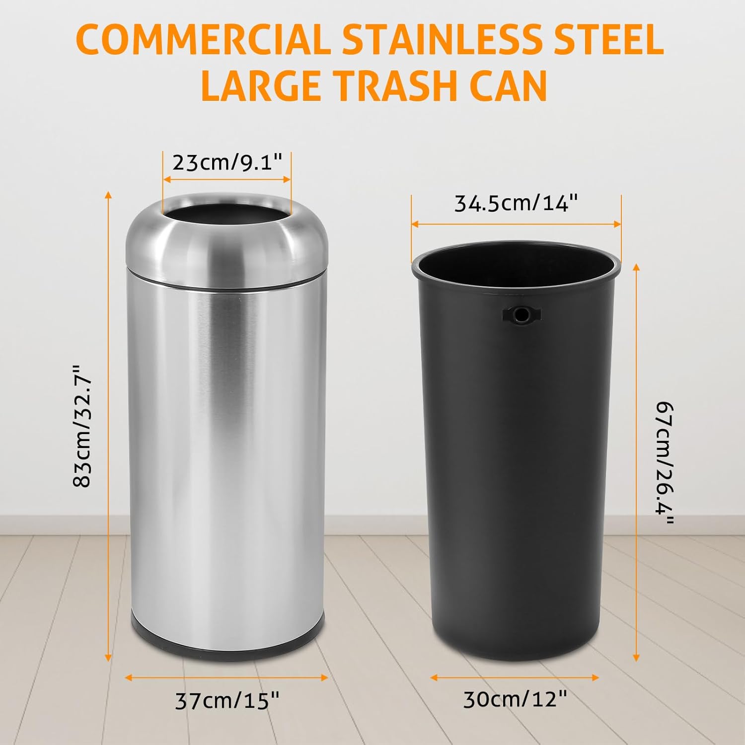 - Spacious 16-Gallon Capacity: This extra-large stainless steel trash can (32.67" tall, 14.56" diameter) offers ample space for high-traffic areas like hotels, restaurants, supermarkets, and homes. Its open-top design ensures easy waste disposal, reducing overflow and frequent emptying