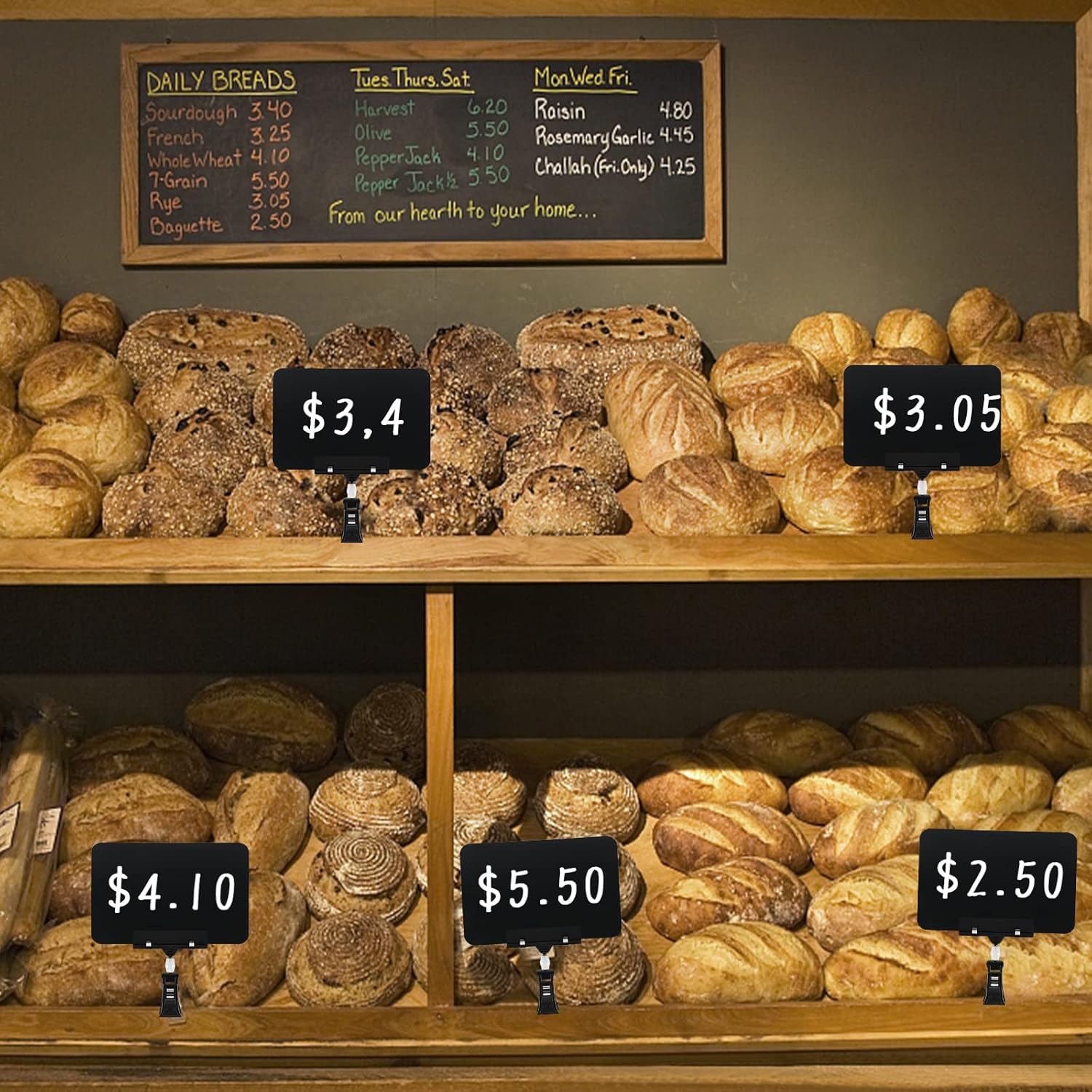 - Merchandise Display Sign Clips: You will get 8 sets price display signs with clip, and 2pcs liquid chalks. These plastic mini chalkboard signs feature with smooth surface and is easy to write and can be reusable. Pop clips-on style sign holder is suitable for supermarket, shop and more.