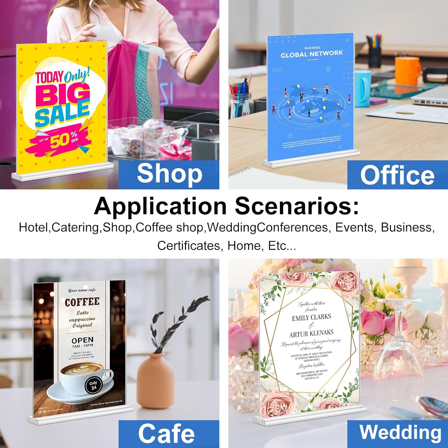 - [Wide Uses] Our 6 Pack acrylic sign holder 8.5x11 are very suitable for restaurants, trade shows, reception areas, schools, weddings, exhibitions, etc.