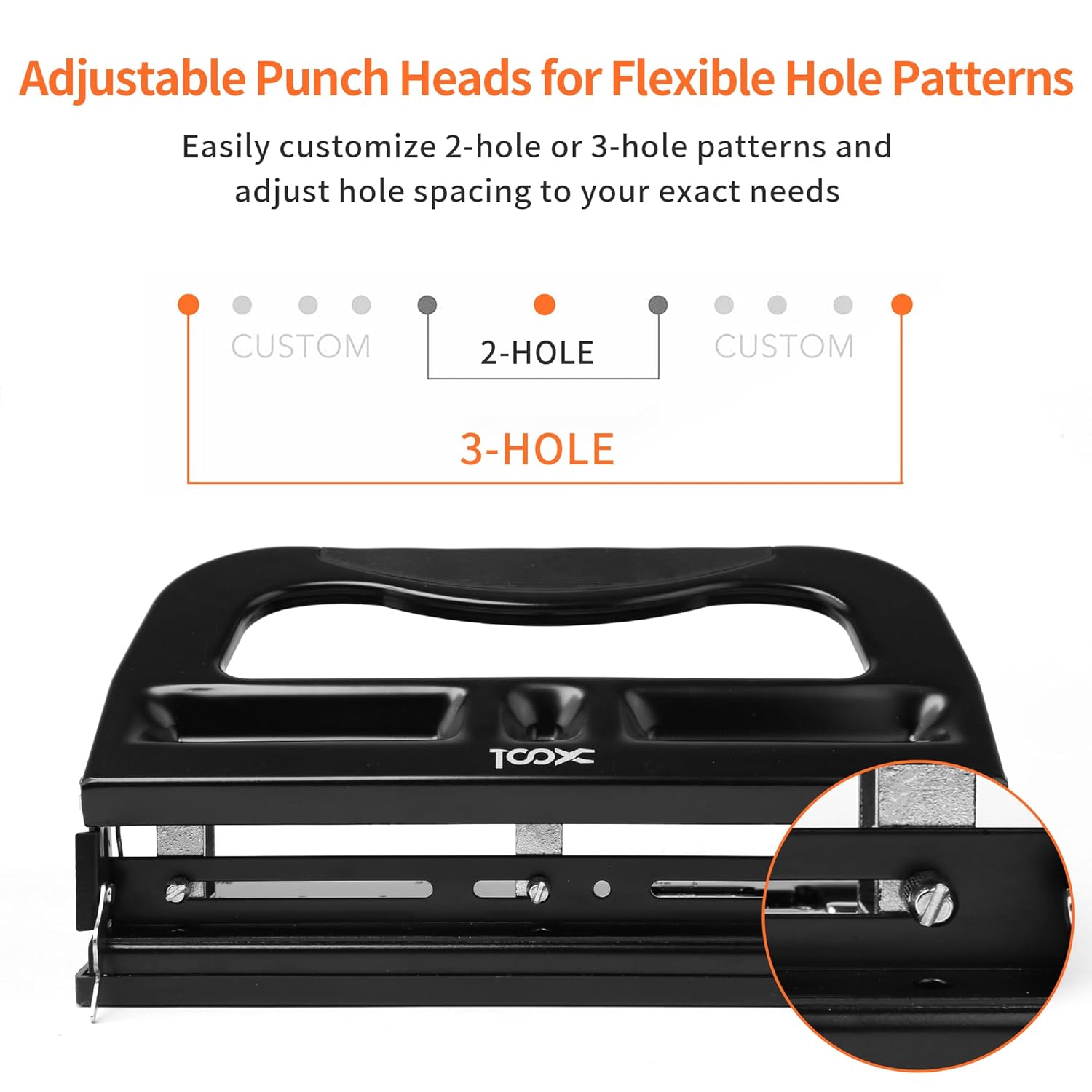 - Adjustable 2 or 3 Hole Punch: Easily switch between 2-hole and 3-hole settings with fully adjustable punch heads. Compatible with A4, US Letter, and various binder typesβideal for school, office, and home use.