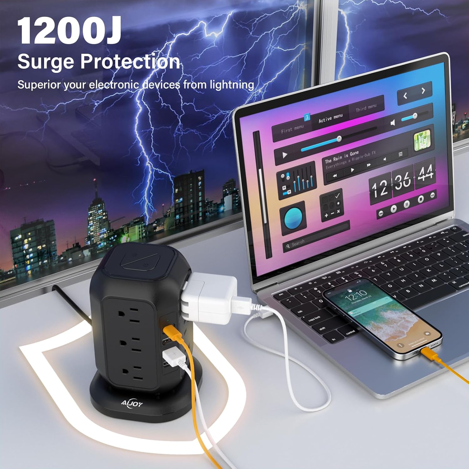 - [POWER YOUR SAFETY] Power strip surge protector has passed FCC, RoHS certification, this surge tower has surge protection, overload protection, short circuit protection, lightning protection. The power tower charging station use the ceramic SPD to automatic cut off the power fastly when voltage surge is detected, to ensure you a safe charging environment. The power tower has a reset button, in case the maximum voltage is exceeded and the unit shuts down.