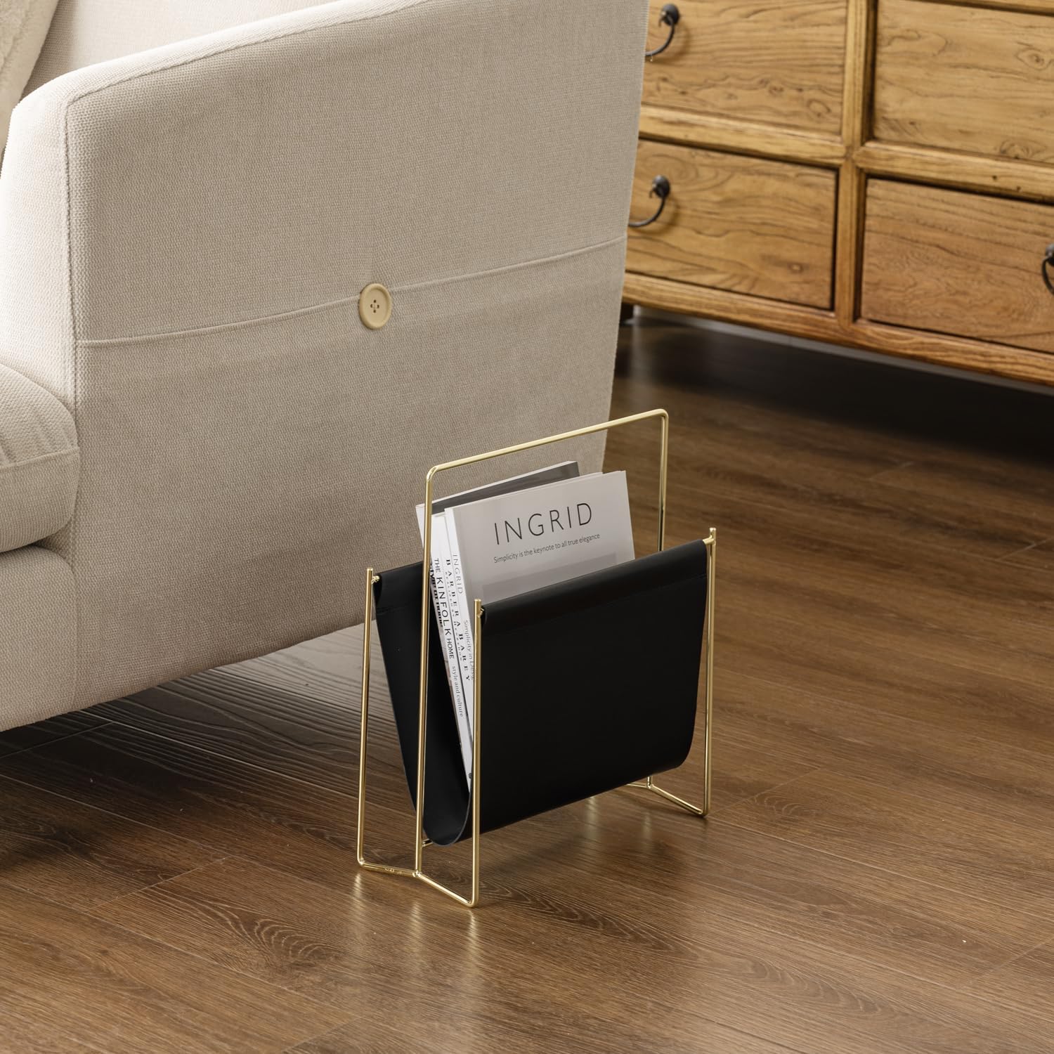 MyGift 13 Inch Modern Black Leatherette Magazine Holder Floor Standing Sling Style Rack with Gold Tone Metal Frame