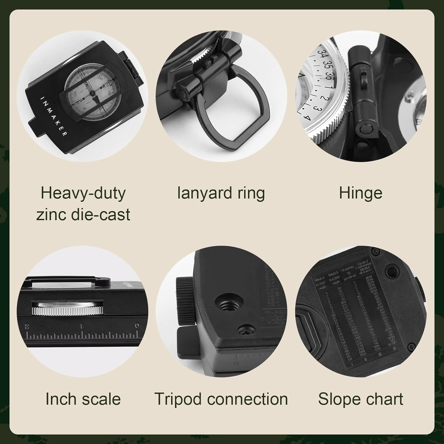 - Small Size, Wide Functions - The INMAKER compass possess a sighting line, magnifier viewer, tripod attachment, reading eyepiece, slope ratio chart and adjustable prism. Definitely portable , compact enough to be fastened on your belt or rucksack without compromising your actions.