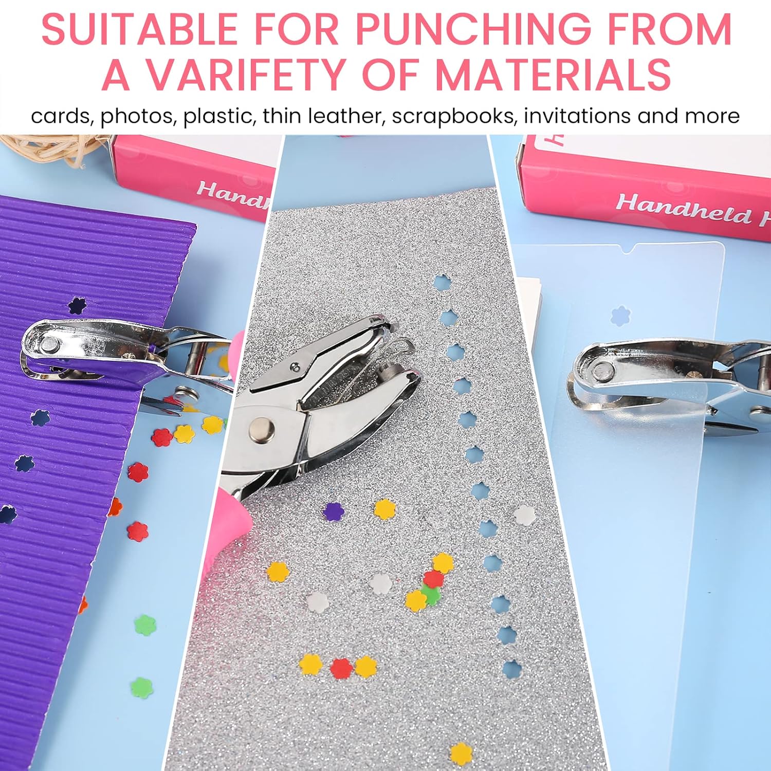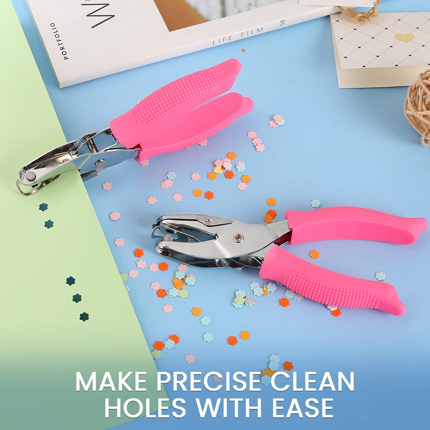 - DURABLE METAL CONSTRUCTION: Handheld single hole punch is made with all-metal construction and features an anti-slip soft rubber grip. The hole puncher is ergonomically designed with cushioned grips which are more comfortable for frequent use. Punches 1/4 in flower shaped holes in paper, thin plastic, foam, cardstock, etc.